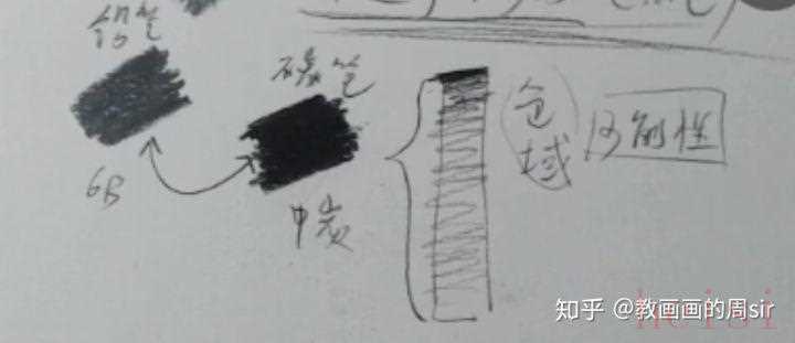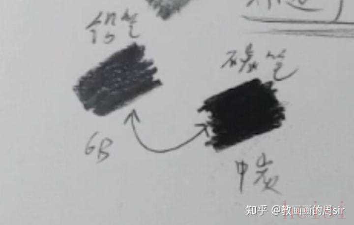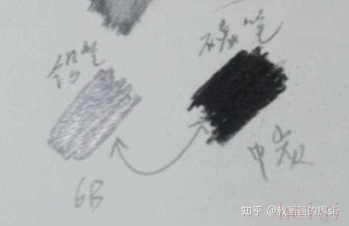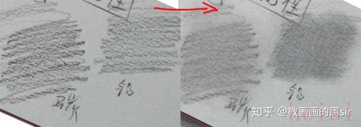 大家能看到,右邊的是中炭涂黑,左邊的是6B鉛筆涂黑。我們更感覺得到,炭筆的黑要比鉛筆更黑吧。