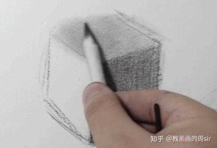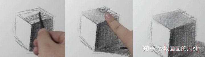 大家可以看到,在這個正方體的頂面色塊上,我用了炭條鋪顏色,然后我只用手指輕輕的一抹,顏色就變淺了!這就是炭條,特別適合配合炭筆畫亮色。
