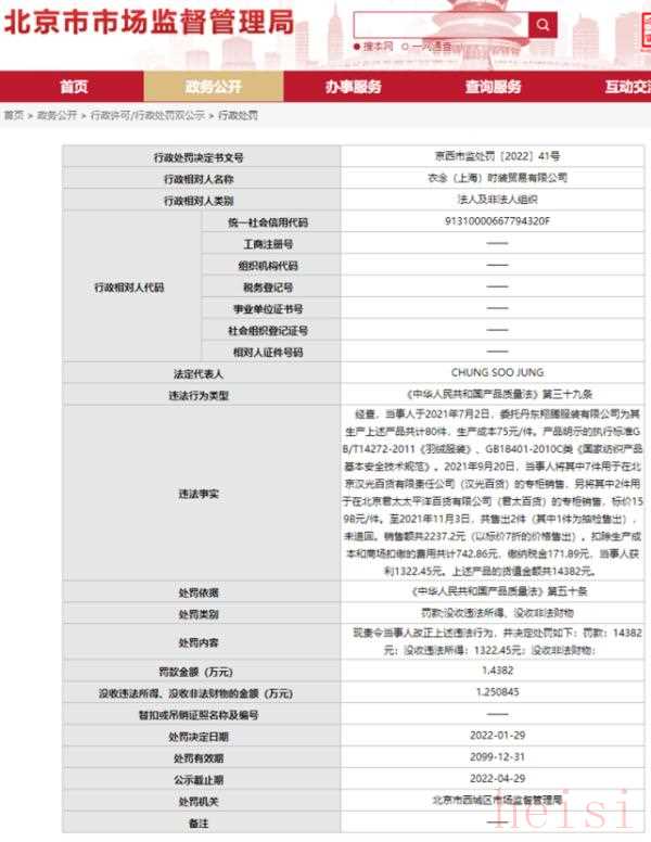 北京市市場監(jiān)督管理局網(wǎng)站公布的行政處罰決定書(京西市監(jiān)處罰〔2022〕41號)顯示,衣念(上海)時裝貿(mào)易有限公司因羽絨服以次充好,被北京市西城區(qū)市場監(jiān)督管理局罰款14382元,并沒收違法所得1322.45元。