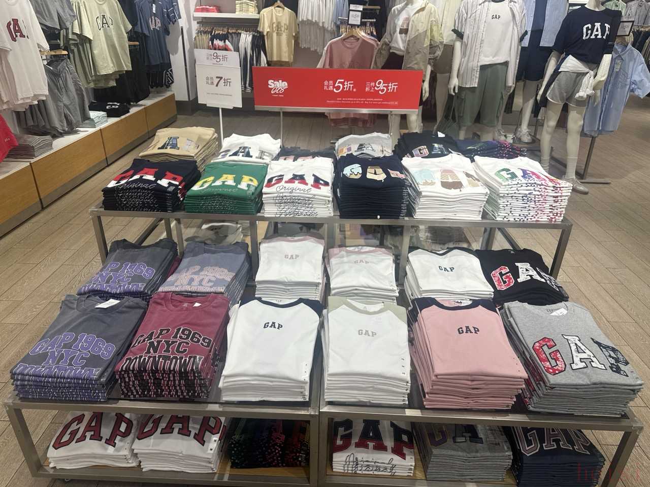 界面時(shí)尚在走訪GAP南京西路旗艦店時(shí)看到,一層男裝與女裝區(qū)域仍以印有品牌Logo的T恤為主力陳列,同時(shí),防曬衣、速干褲等功能性新品也被集中擺放在門店中庭,形成獨(dú)立貨架區(qū)。在天貓、抖音等平臺(tái)的GAP官方旗艦店上,T恤同樣是最熱銷的核心單品。