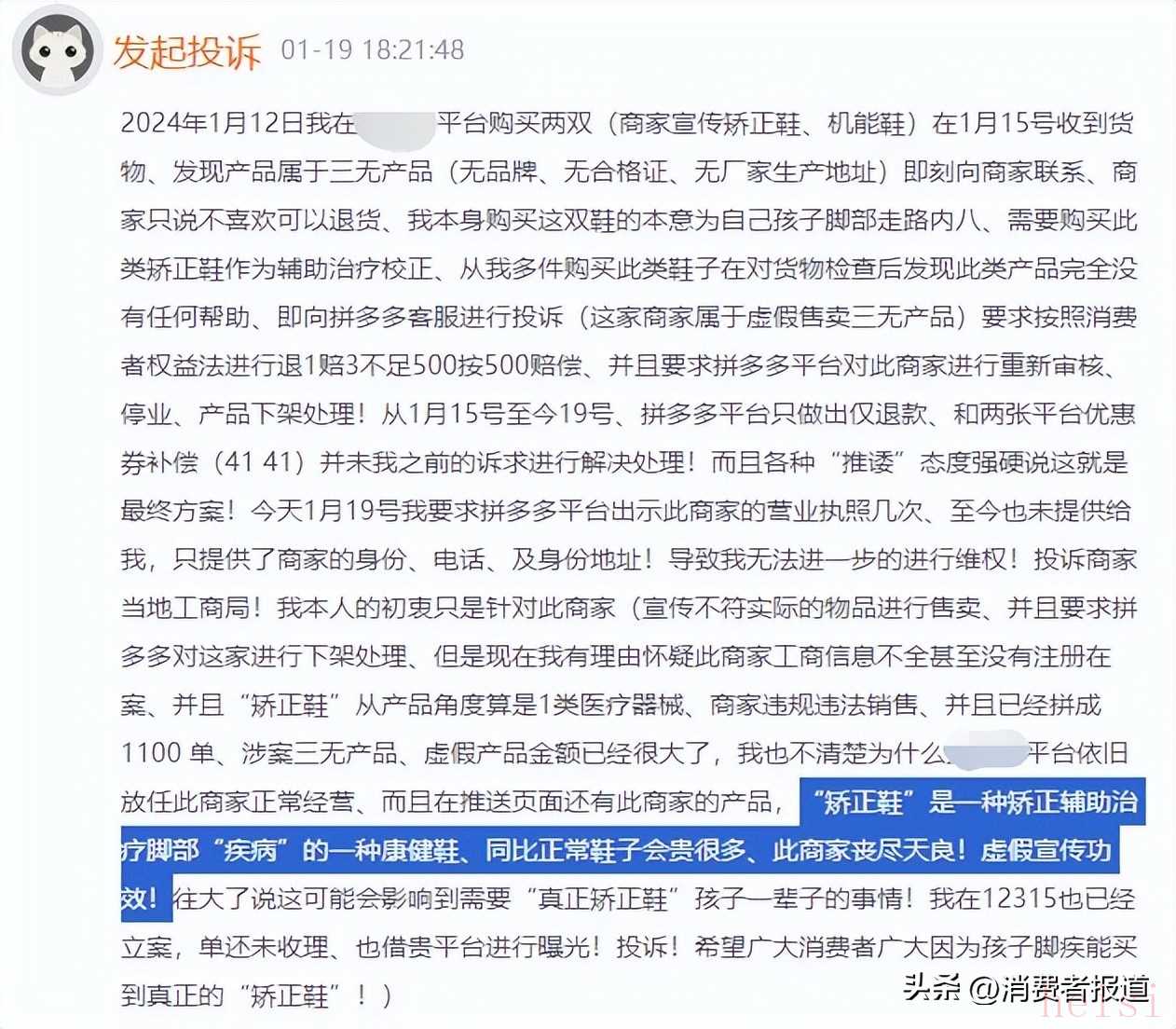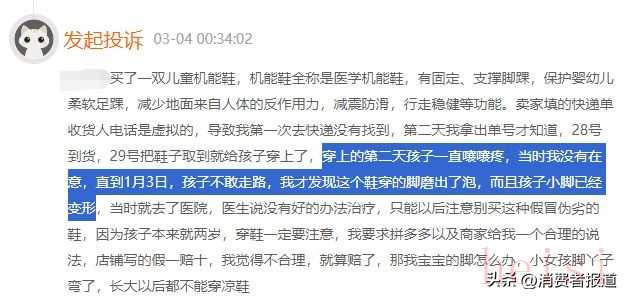 在黑貓投訴平臺上,《消費者報道》記者也發(fā)現(xiàn)部分關于“機能鞋”的投訴。有消費者投訴“購買后因為鞋子版型的問題,有一雙根本就穿不了”“穿上的第二天孩子一直嚷嚷疼,當時我沒有在意,直到1月3日,孩子不敢走路,我才發(fā)現(xiàn)這個鞋穿的腳磨出了泡,而且孩子小腳已經(jīng)變形”。