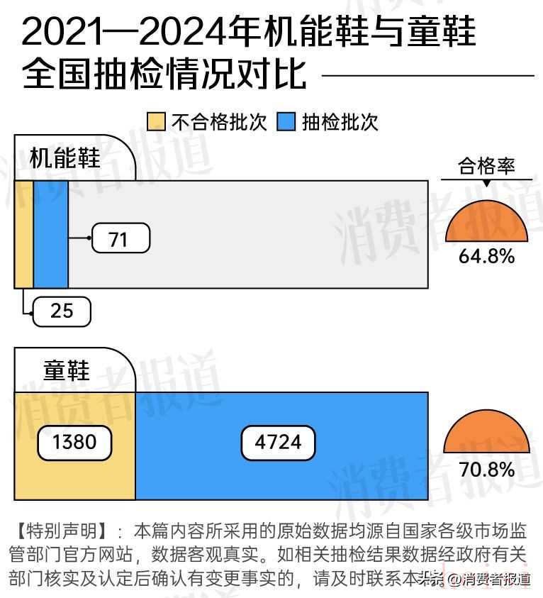 據(jù)《消費者報道》統(tǒng)計,3年多來(2021年1月至2024年5月),國家市場監(jiān)督管理總局及省市級市場監(jiān)督管理局共抽檢機能鞋71批次,其中25批次不合格,合格率不足65%。而童鞋(包括機能鞋在內(nèi)的所有童鞋)的合格率高達70.8%。
