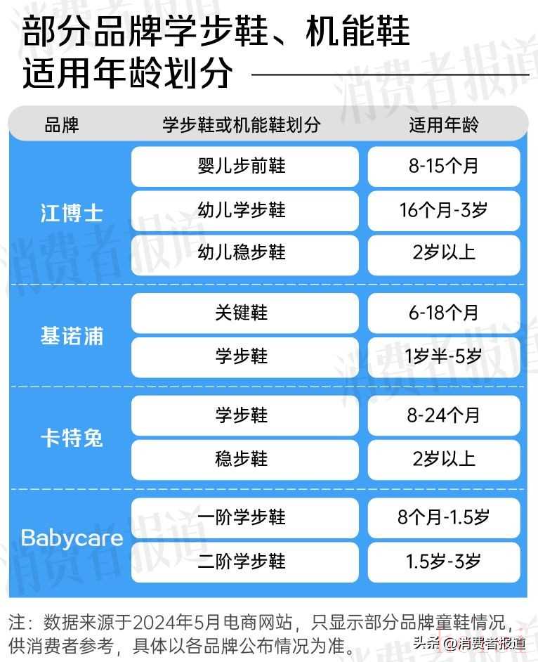 例如江博士根據(jù)寶寶的不同年齡階段的足部發(fā)育情況及學步需求而設計的健康鞋,分為嬰兒步前鞋、幼兒學步鞋、幼兒穩(wěn)步鞋,嬰兒步前鞋適合爬行期至學步初期(參考年齡:約8-15個月),幼兒學步鞋適合學步期(參考年齡:約16個月-3歲),幼兒穩(wěn)步鞋適合穩(wěn)步期(參考年齡2歲以上);基諾浦則分類為關鍵鞋(6-18個月寶寶)和學步鞋(1歲半-5歲寶寶);卡特兔根據(jù)寶寶的年齡和腳長分為學步鞋和穩(wěn)步鞋,學步鞋適合8-24個月,穩(wěn)步鞋適合2歲以上;Babycare則將孩子學步分為一階啟步期(8個月-1.5歲)和二階穩(wěn)步期(1.5歲-3歲),也分別推出了對應的學步鞋。