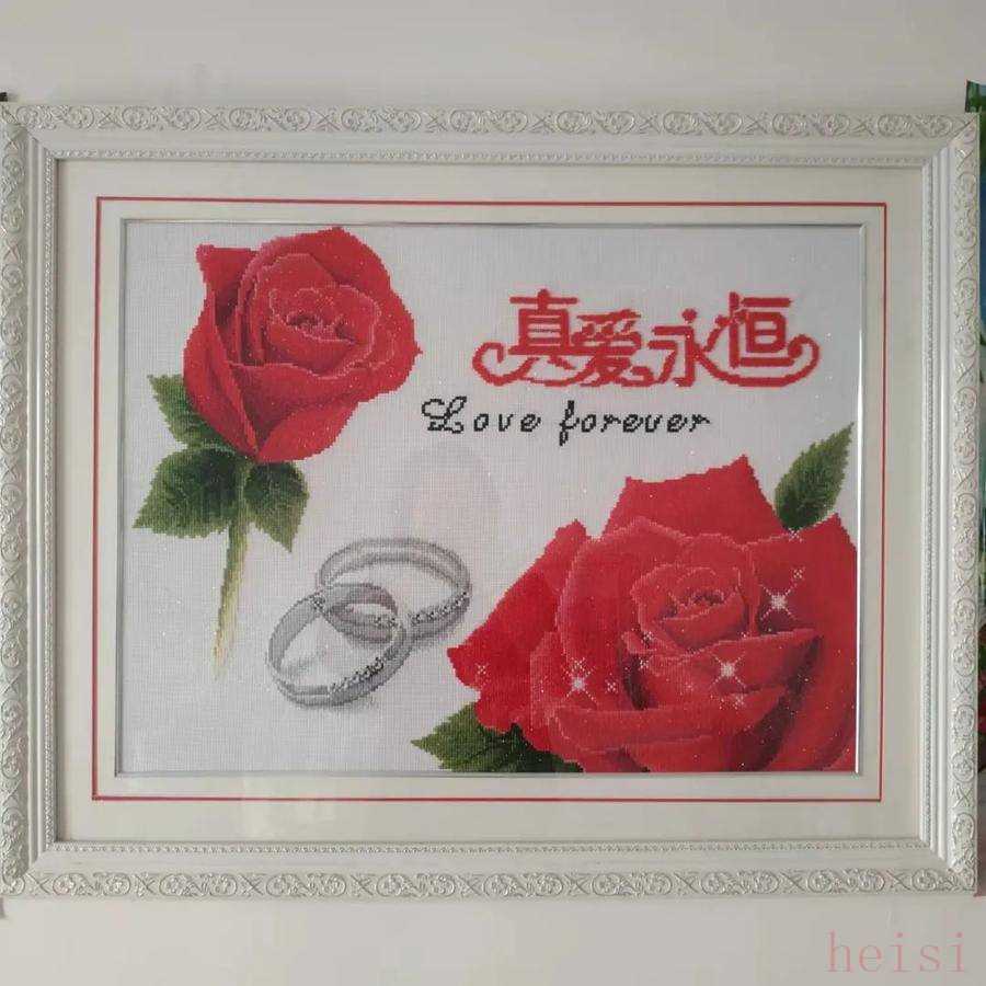 那是一家“ks品牌 十字繡”門店,店面并不大,十字繡品種卻不少,有風景的、花草的、人物的、動物的、卡通的,諸如此類等等,五顏六色。裝裱好的成品十字繡,或掛于墻上,或擺在門店門口,活靈活現(xiàn),栩栩如生。在眾多的十字繡圖案樣品中,一幅“真愛永恒”十字繡赫然映入我的眼簾,那是一幅由銀色框架裝裱好的十字繡成品,圖案由兩朵鮮紅的玫瑰花組成,一朵盡情盛開,一朵含苞待放,兩朵花兒中間有兩枚銀色的戒指,圖案右上方是用一顆顆鮮紅的小珠粒串起的“真愛永恒”字樣。鮮紅的玫瑰花象征著純真、浪漫、天長地久的愛情,這是一幅多么美好的圖案!