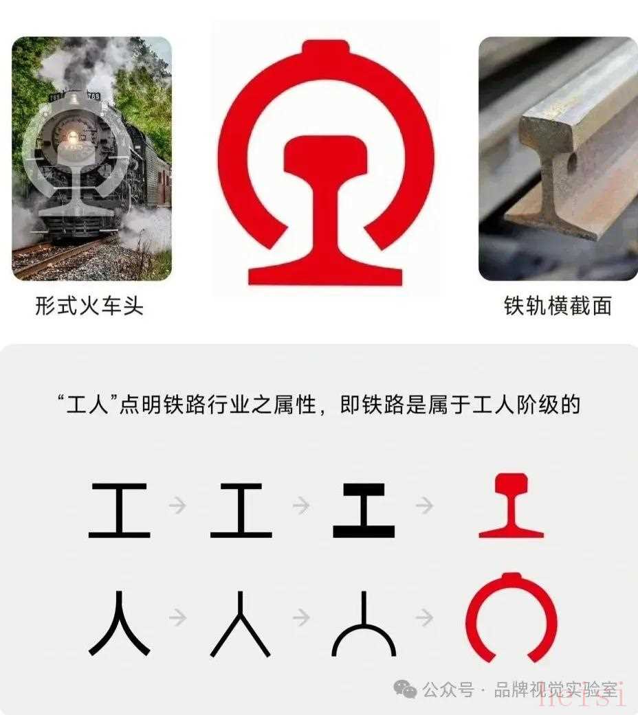 由變體的“工人”二字組合構(gòu)成,“人”字呈環(huán)形圍繞在“工”字上方,好似出生的太陽,“工”字在下,其與鐵路鐵軌的橫切面形狀相吻合,且“工”字下面一橫拉長,代表地平線。以紅色為背景圖案,白色為徽標(biāo)顏色,醒目突出。“工人”點明鐵路行業(yè)屬于工人階級,體現(xiàn)了鐵路工人當(dāng)家作主的自豪感和責(zé)任感。從整體形象看,它構(gòu)成了一個完整的火車頭形象,蘊含磅礴氣勢和無窮力量,外圍圓圖案象征機車車輛部門,中下部的鋼軌截面象征路網(wǎng)部門,標(biāo)志著中國鐵路各部門。此外,在新中國成立初期的背景下,也體現(xiàn)了廣大鐵路工人乃至中國人民戰(zhàn)天斗地、改造自然的豪邁之氣。