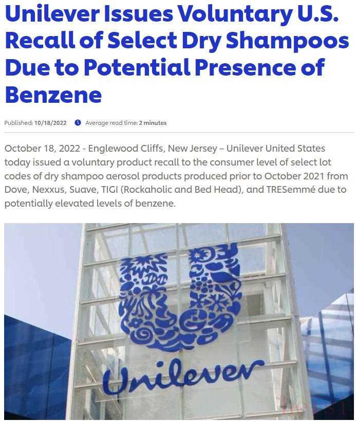聯(lián)合利華10月18日在其公司官網(wǎng)發(fā)布信息稱,因旗下多個品牌產(chǎn)品中有19款干發(fā)噴霧產(chǎn)品苯含量可能升高,向消費者發(fā)起產(chǎn)品自愿召回公告。據(jù)美國衛(wèi)生和服務(wù)部稱,苯作為人類致癌物之一,通過吸入、口服和通過皮膚接觸苯都可能導(dǎo)致癌癥、白血病和骨髓血癌以及其他可能危及生命的血液疾病。