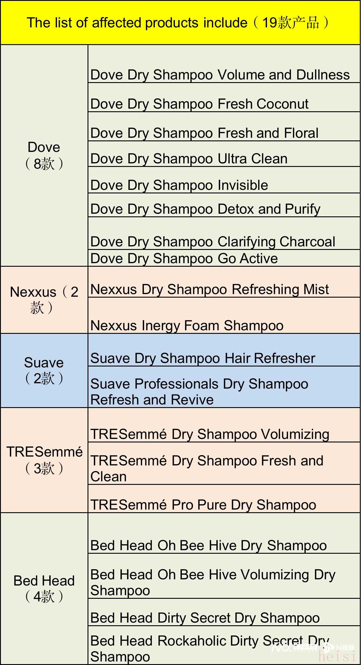 聯(lián)合利華發(fā)布的信息稱,本次召回的產(chǎn)品涉及Dove、Nexxus、Suave、TIGI(Rockaholic 和 Bed Head)和 TRESemmé 等品牌,于2021年10月之前生產(chǎn)的干洗氣霧劑型洗發(fā)產(chǎn)品。聯(lián)合利華表示,根據(jù)一項獨立的健康危害評估,在檢測中發(fā)現(xiàn)的水平下,每天接觸召回產(chǎn)品中的苯,預(yù)計不會造成不良的健康后果。聯(lián)合利華稱到目前為止,還沒有收到與此次召回有關(guān)的不良事件報告,召回這些產(chǎn)品是出于謹慎的考慮。被召回的產(chǎn)品在美國全國范圍內(nèi)銷售,已經(jīng)通知零售商將召回的產(chǎn)品下架。