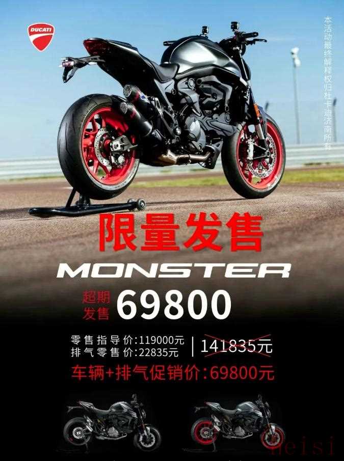 近日,國(guó)內(nèi)某杜卡迪經(jīng)銷商掛出超期的Monster 950車型,原車+特米排氣價(jià)格低至69,800元!雖然是超期車型但這價(jià)格不禁讓人感嘆真的是太便宜了,沒想到當(dāng)初杜卡迪最經(jīng)典的“怪獸”車型如今會(huì)落得如此田地。喜歡的車友不妨抓住這波機(jī)會(huì)下手!