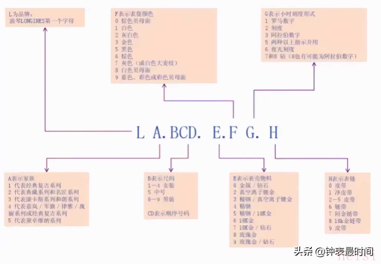 ▲浪琴編號(hào)模式:L A.BCD.E.FG. H。編號(hào)由品牌、系列、尺寸、次序號(hào)碼、材料、手表指示、表鏈/表帶組成。