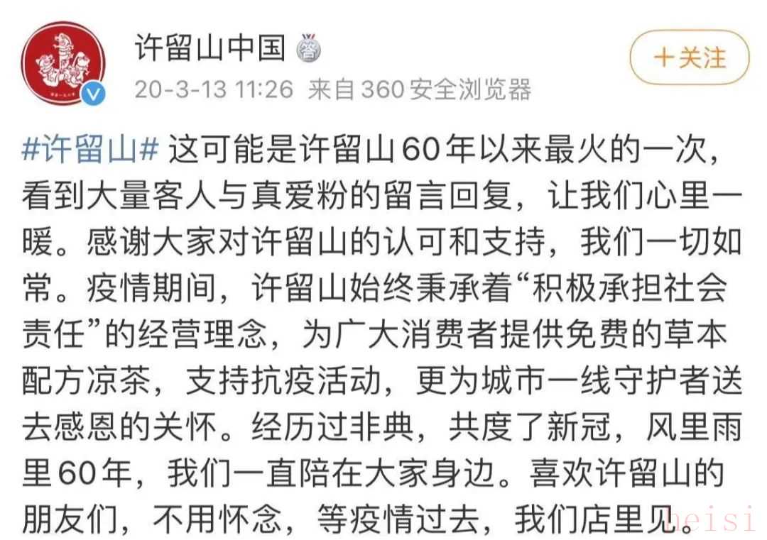 在2020年爆出香港欠租新聞時許留山曾首次登上微博熱搜大量食客排隊留言惋惜懷念彼時它通過微博“許留山中國”發(fā)布了一則消息自嘲“這可能是許留山60年以來最火的一次”并聲稱內地門店的營業(yè)狀況不會受到影響