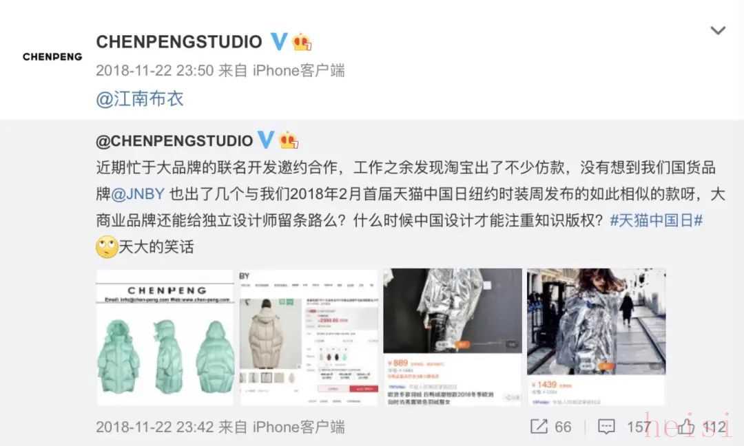 2018年11月,獨(dú)立設(shè)計(jì)師品牌CHENPENG微博稱,JNBY的多款羽絨服與其2018年2月在首屆天貓中國日紐約時(shí)裝周發(fā)布的款式高度相似,但江南布衣并未作出回應(yīng)。