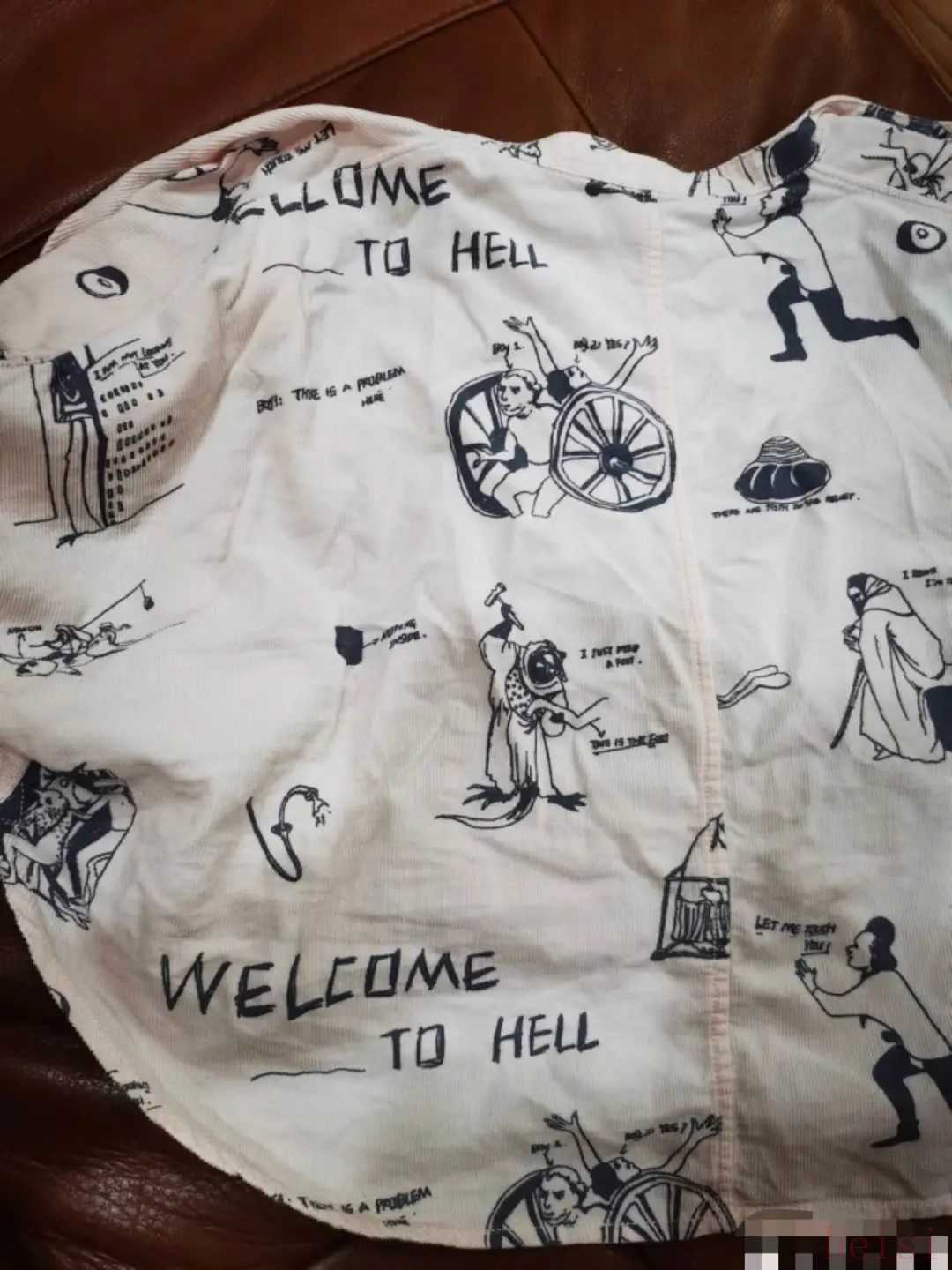9月19日,一位網(wǎng)友在社交平臺(tái)發(fā)文稱,江南布衣童裝印有“welcome to hell”字樣和各種“煉獄圖”。其上傳的圖片顯示,衣服上還印有“l(fā)et me touch you”“I just need a foot”等英文以及形態(tài)怪異的生物手持工具砍向一只腿的圖案。
