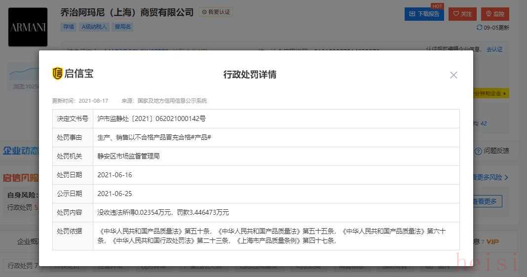 據(jù)啟信寶,就在今年6月,喬治阿瑪尼(上海)商貿有限公司新增一則行政處罰,處罰事由為生產(chǎn)、銷售以不合格產(chǎn)品冒充合格產(chǎn)品,處罰結果為沒收違法所得235.4元,罰款3.446473萬元,決定文書號滬市監(jiān)靜處〔2021〕062021000142號,處罰單位為靜安區(qū)市場監(jiān)督管理局。