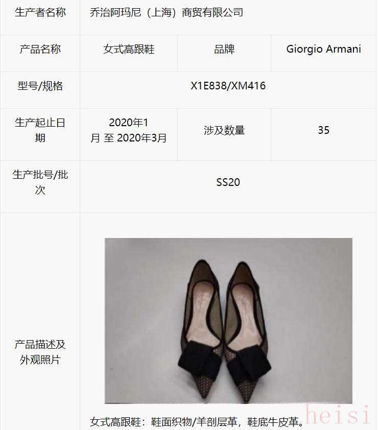 報道稱,喬治阿瑪尼將召回型號規(guī)格為X1E838/XM416,生產(chǎn)批次為SS20的女士高跟鞋,共計35雙。