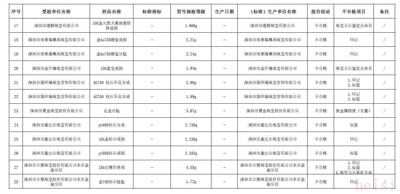 根據(jù)深圳市市場(chǎng)監(jiān)督管理局發(fā)布的公告,近期對(duì)深圳市市場(chǎng)流通的珠寶首飾進(jìn)行了監(jiān)督抽查,結(jié)果顯示有28批次產(chǎn)品不合格。這些不合格產(chǎn)品涉及的主要問題是: