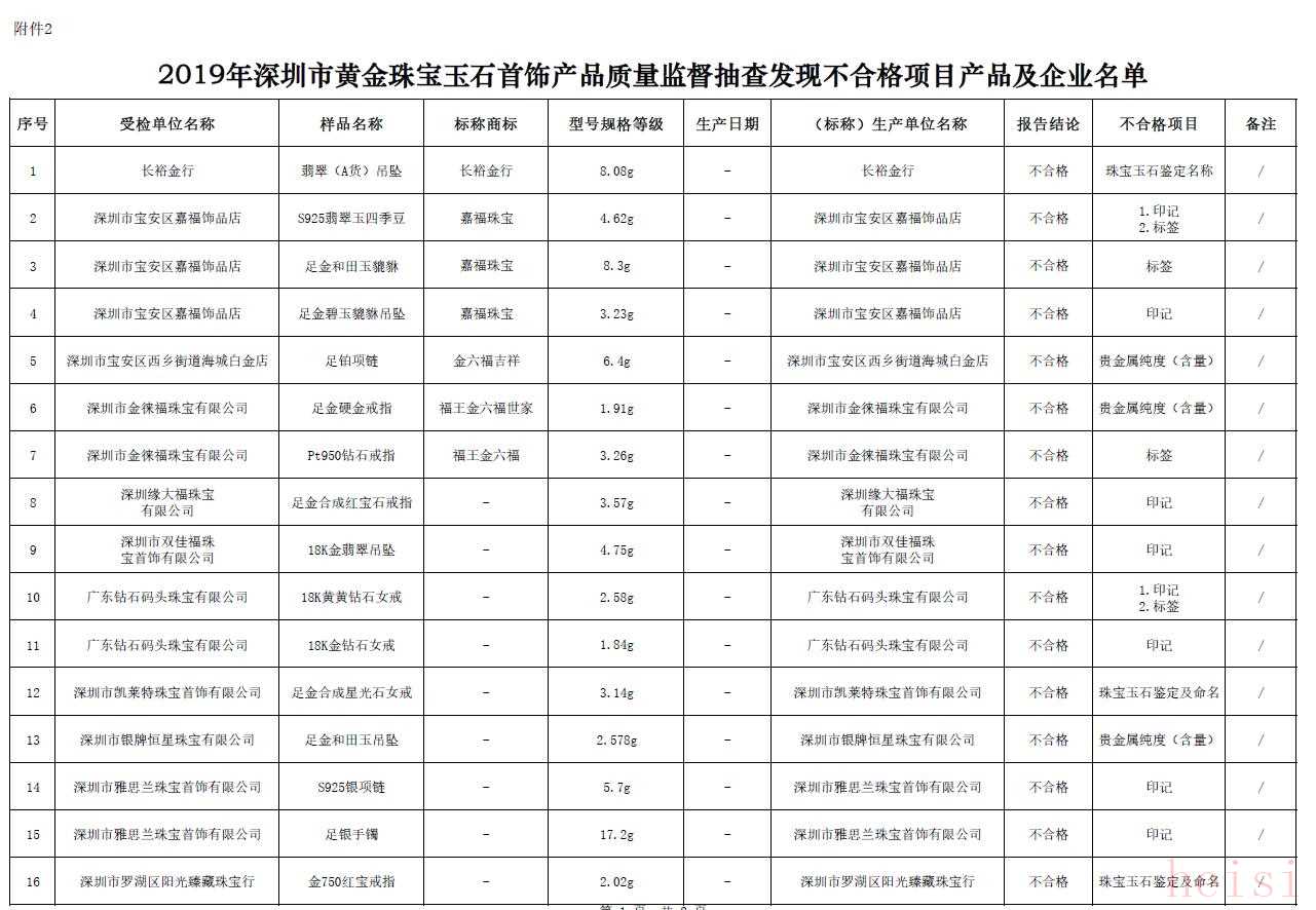 近日,深圳市市場(chǎng)監(jiān)管局發(fā)布2019年全市黃金珠寶玉石首飾產(chǎn)品質(zhì)量監(jiān)督抽查結(jié)果,本次共抽查了127家受檢單位生產(chǎn)、銷售的350批次產(chǎn)品,檢驗(yàn)發(fā)現(xiàn)不合格樣品28批次,不合格產(chǎn)品發(fā)現(xiàn)率8%。其中,3批次嘉福珠寶產(chǎn)品不合格,金六福吉祥、福王金六福世家等品牌上榜。