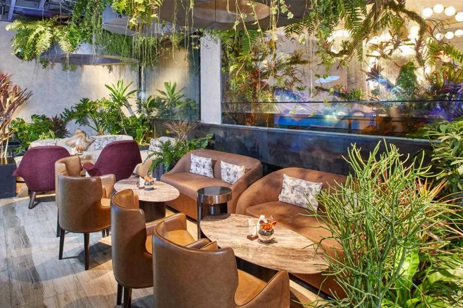 二樓大廳區(qū)別于一樓的藝術(shù)氛圍,將城市中喧鬧的餐廳,變成了質(zhì)樸的熱帶園林;各種鮮活的熱帶植物中藏匿著餐桌與座椅,既增加了若隱若現(xiàn)的私密感,更多了回歸原始自然的初心。