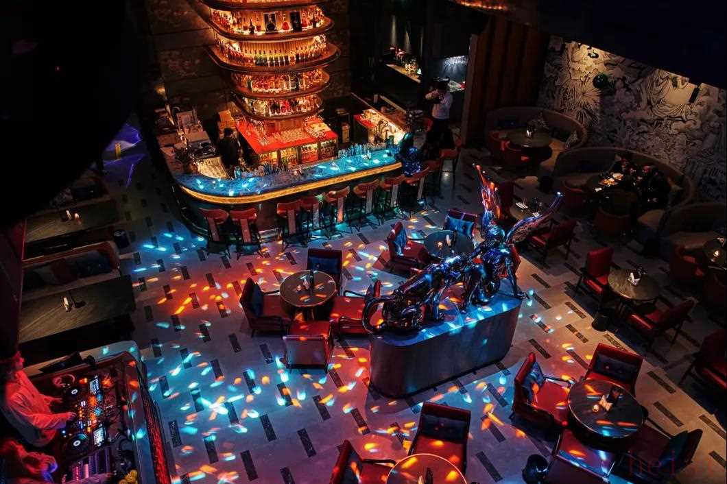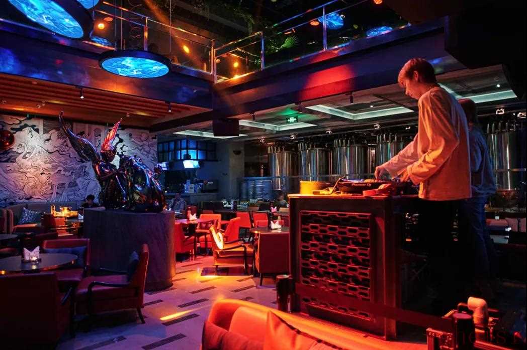 每日21點(diǎn)以后,駐場DJ現(xiàn)場打碟演繹,餐廳進(jìn)入一種魔幻式的場景轉(zhuǎn)變—酒吧模式。全場燈光昏暗,霧氣繚繞,棚頂?shù)臋C(jī)械燈光隨著音樂的節(jié)奏高低起伏,這樣的場景讓人不自覺的跟著節(jié)奏扭動身體,小酌幾口杯中酒,帶著一點(diǎn)微醺的酒意,放下全身的疲憊與束縛。