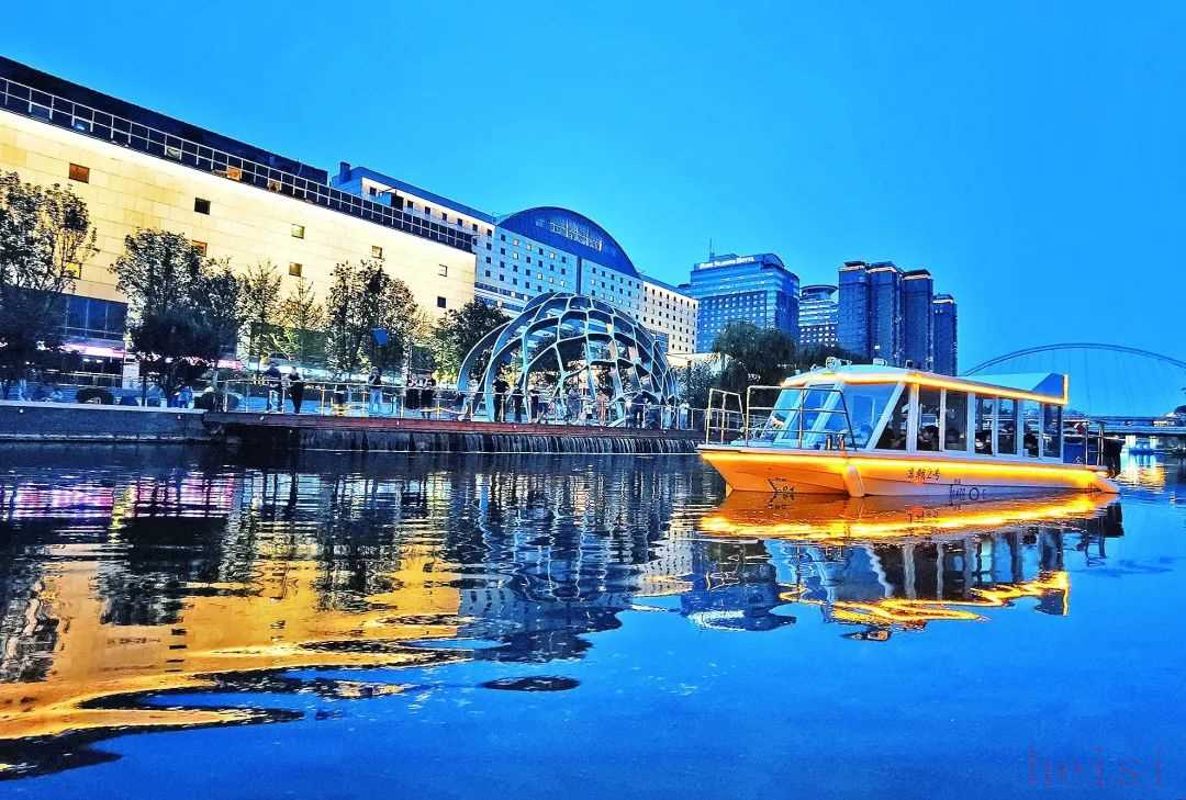 亮馬河國際風(fēng)情水岸位于朝陽區(qū)。去年7月,正式開通了夜游航線。本次通船航線全長1.8公里,起于燕莎碼頭,終點(diǎn)是藍(lán)港碼頭。全部游覽下來大約45分鐘。途中還有有沉浸式體驗(yàn)鉑宮閘室光影秀。
