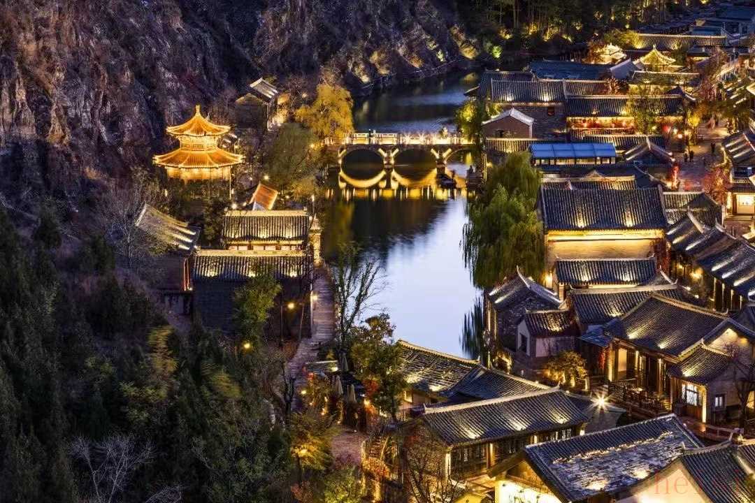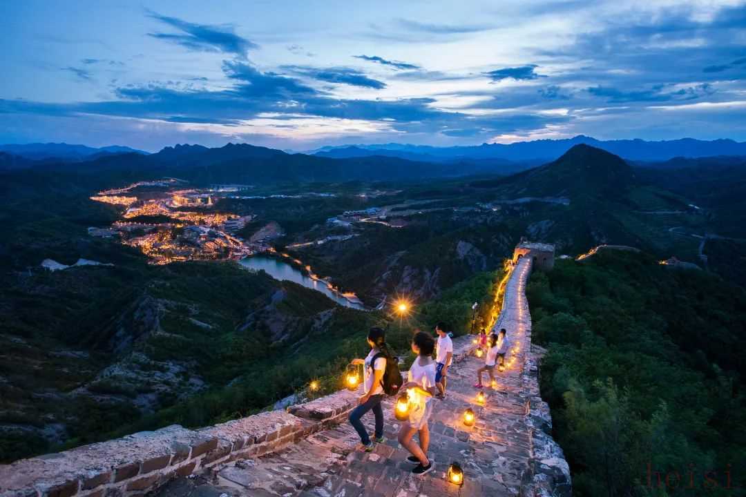 遠(yuǎn)處長城巍峨,近前漁舟燈火。夜游古北水鎮(zhèn),星辰、月亮照亮黑夜,踏著月色和美景,手提一盞孤燈,宛如走入時光之河。