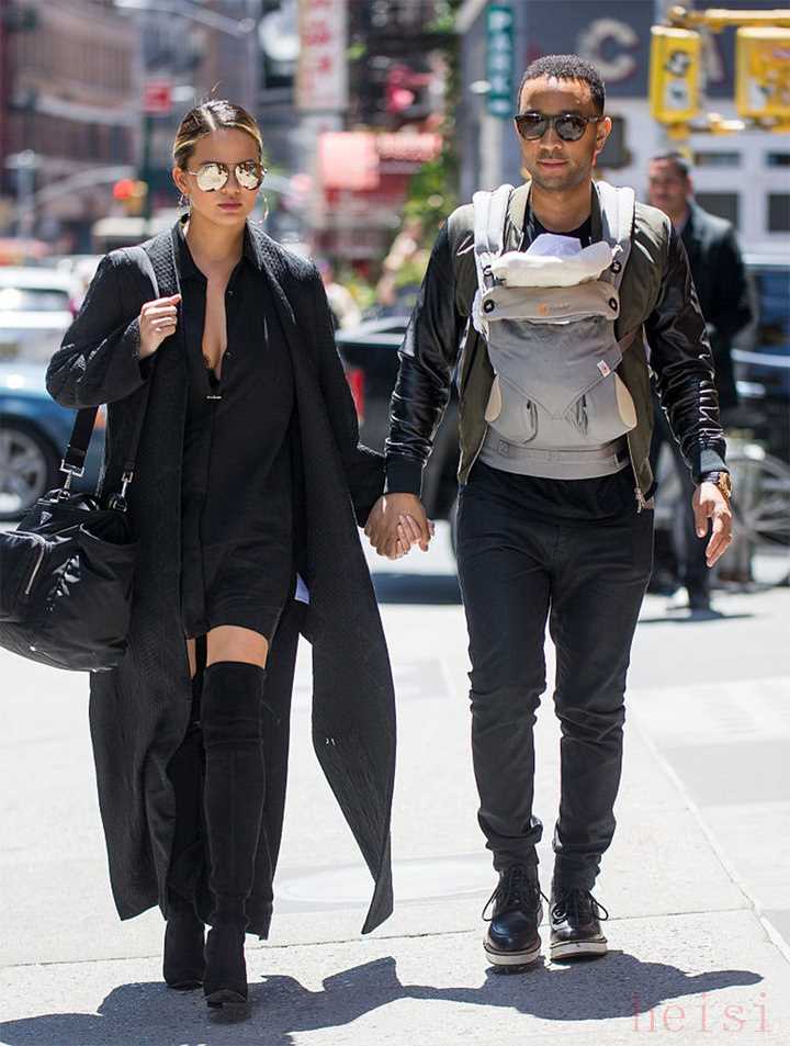 照片中,被傳奇哥牽著的傳奇嫂一身黑色裝扮,大大方方地秀胸秀長腿,而一旁的傳奇哥穿著飛行員夾克和休閑褲,最吸睛的卻是掛在肩上和系在腰上的嬰兒背帶,里面躺著他們的第一個孩子 Luna。