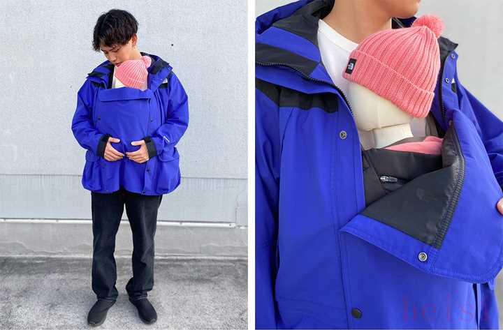 用來抱嬰兒的嬰兒罩以圓形按扣與衣服連接,衣服上的拉鏈還是可以拉到脖子上,因此就算抱著孩子也不會冷到自己,完美呼應(yīng)爸爸們「好找、好拿、不冷」心聲。