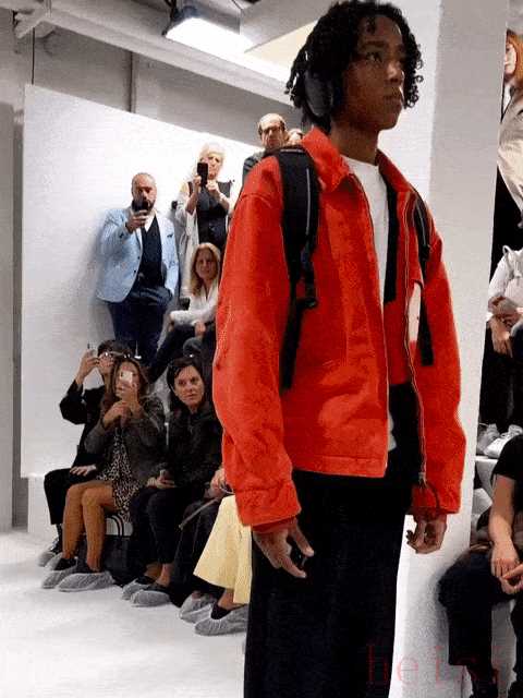 為了走秀換上玫粉色美瞳的 Momo Ndiaye 可以說是最暗黑的新爸爸了——卡其色長風衣和連帽長外套疊穿,還帶著一頂破破爛爛的鴨舌帽。