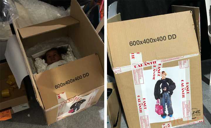 這些可愛娃娃被當成配件,放到裝滿泡沫的紙箱里,送到 5 位男模特跟前,與新爸爸見面。5 位新爸爸穿上黑色嬰兒背帶,將他們的孩子背上,到秀場上逛街去了。