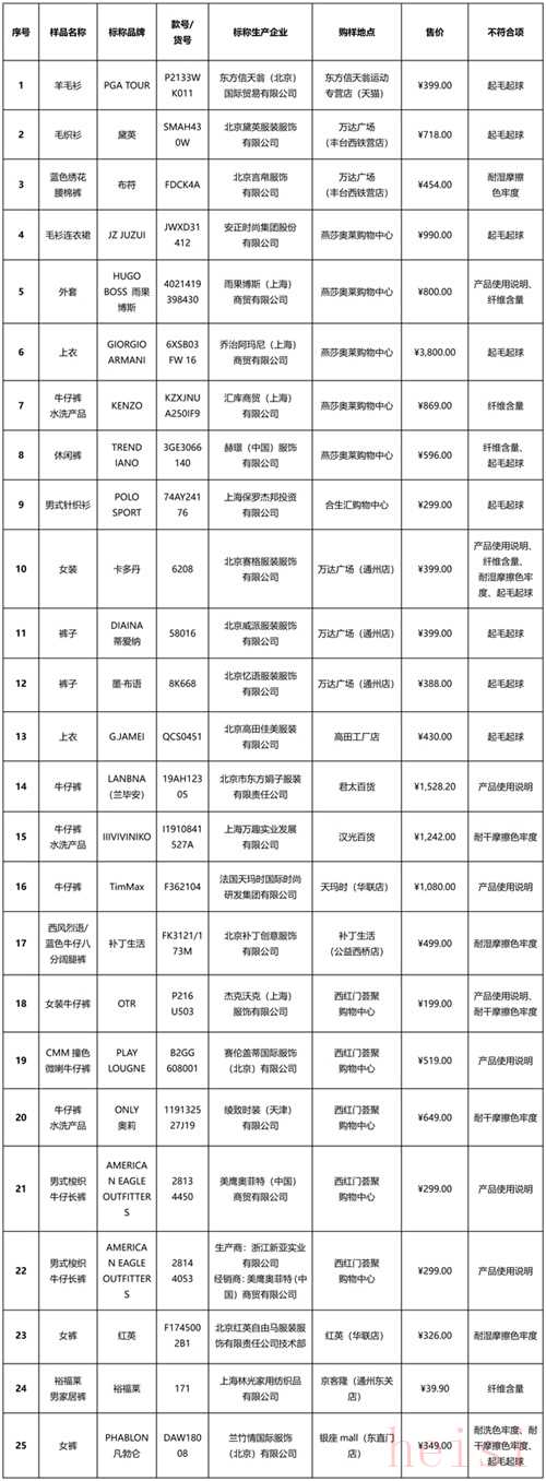 中國經(jīng)濟(jì)周刊-經(jīng)濟(jì)網(wǎng)訊 7月30日,北京市消費(fèi)者協(xié)會(huì)發(fā)布消息稱,經(jīng)過對(duì)76個(gè)品牌、100件樣品的試驗(yàn)檢測(cè),有25件樣品未達(dá)到國家及相關(guān)標(biāo)準(zhǔn)要求,整體不達(dá)標(biāo)率為25%,其中不乏HUGO BOSS、阿瑪尼、KENZO、TRENDIANO、ONLY、AE等知名品牌。