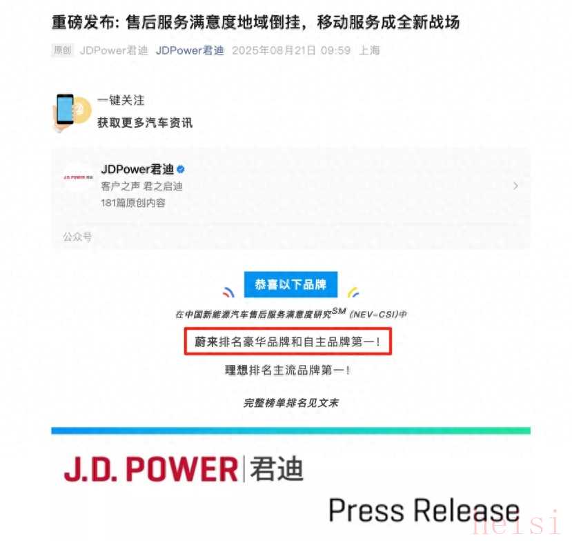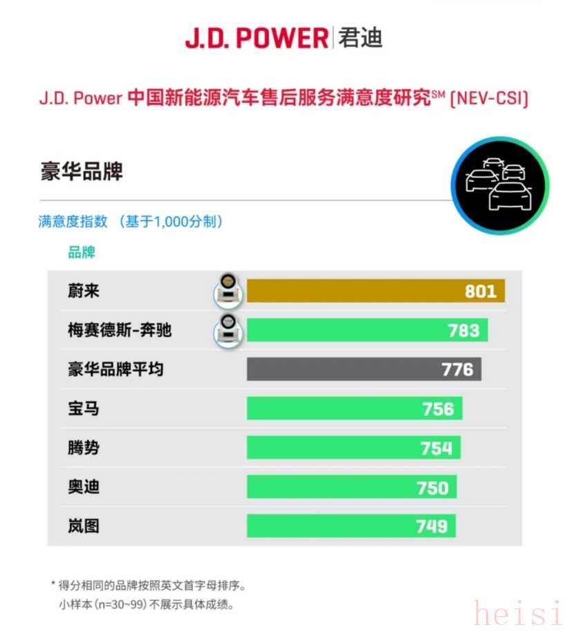 蔚來(lái)榮耀登頂,J.D. Power豪華品牌中國(guó)新能源車售后服務(wù)榜首,超越奔馳獨(dú)占鰲頭