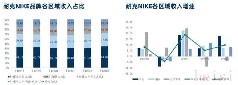 按區(qū)域來(lái)看,北美仍是最主要銷售區(qū)域,根據(jù)FY2023年數(shù)據(jù),貢獻(xiàn)44.3%的收入,大中華區(qū)在FY2021貢獻(xiàn)近20%的收入,由于新疆棉事件和國(guó)潮,NIKE品牌份額有所下降,至FY2023年收入占比下降至14.9%。