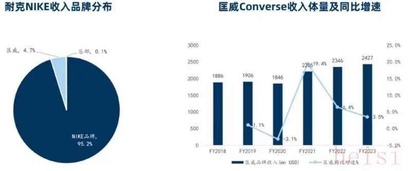 NIKE品牌收入占比集團(tuán)95%左右,匡威ConverseFY2024收入規(guī)模在24.3億美金,收入一直CAGR維持在單位數(shù)增長(zhǎng)。