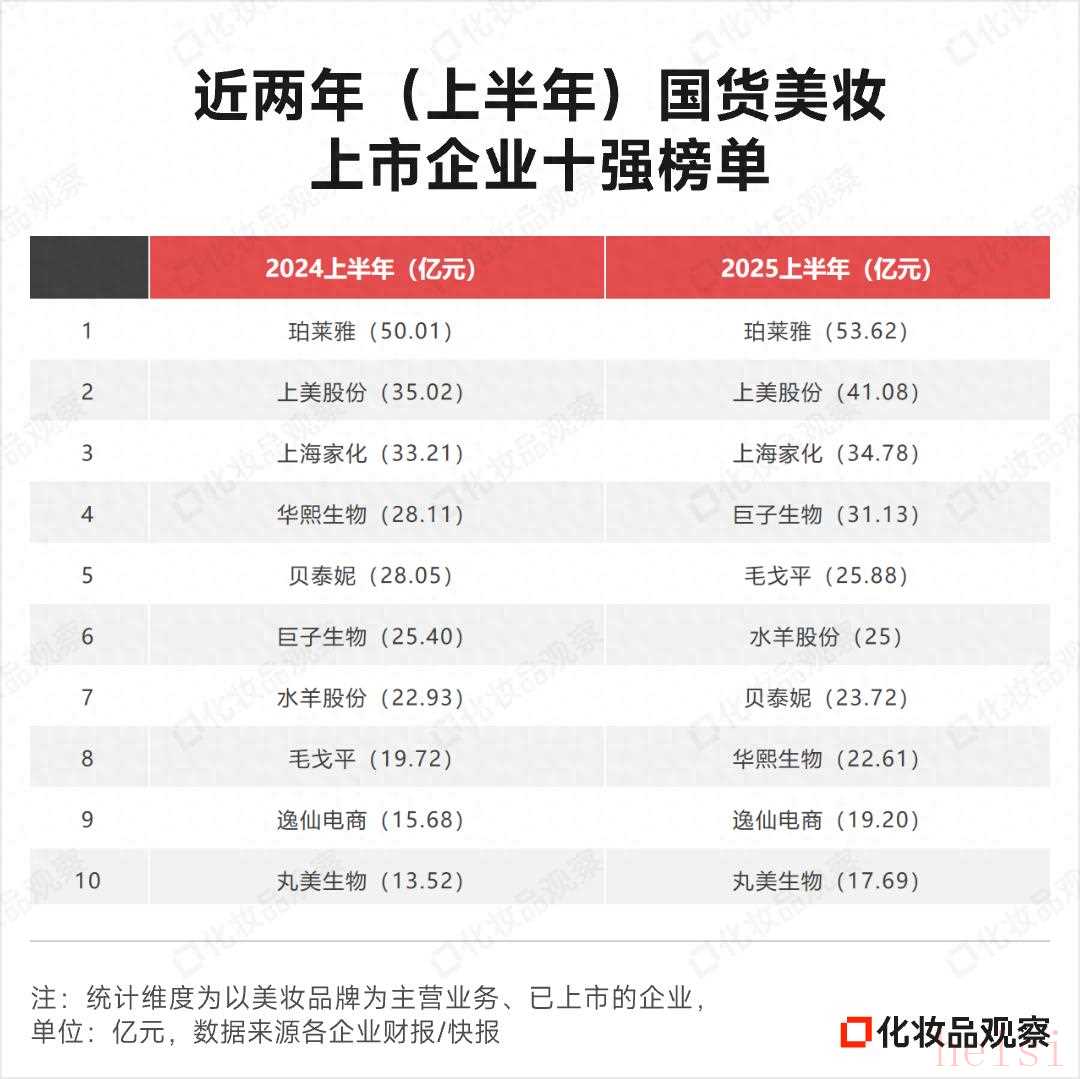 巨子生物、毛戈平挺進(jìn)前五。上半年,巨子生物和毛戈平均取得高雙位數(shù)增長(zhǎng),營(yíng)收分別突破31億元、25億元,進(jìn)入前五行列。