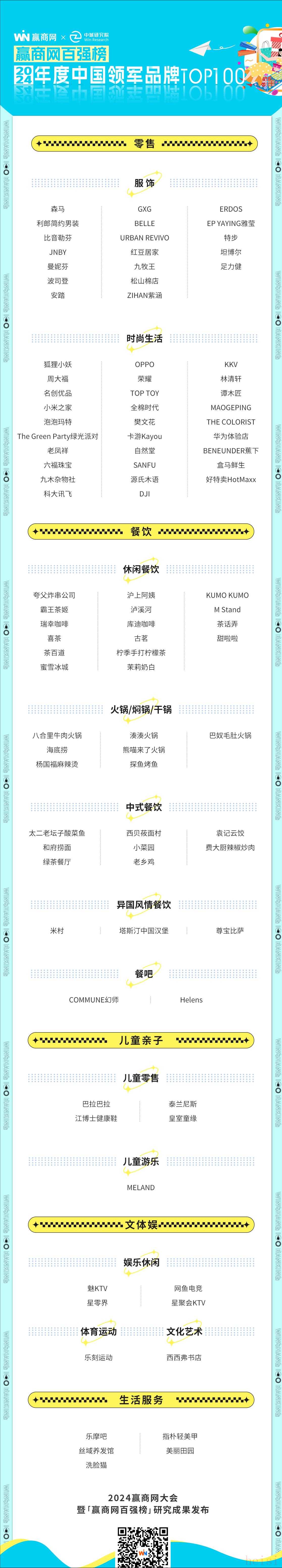 12月18日,“2024贏商網(wǎng)大會暨『贏商網(wǎng)百強榜』研究成果發(fā)布”在上海舉辦。由贏商網(wǎng)聯(lián)合中城研究院發(fā)起的『贏商網(wǎng)百強榜』正式發(fā)布:包含零售商業(yè)地產(chǎn)企業(yè)榜單、購物中心榜單、品牌榜單,本篇為“2024年度中國領(lǐng)軍品牌TOP100”。現(xiàn)在不是一個風(fēng)口的時代,而是一個扎根的時代。2024的年歷上,我們再次聚焦100個打動人心的“中國領(lǐng)軍品牌”。其中,超一半的品牌是蟬聯(lián)上榜者,而另一半則是長風(fēng)破浪逆勢而來的新秀領(lǐng)軍。