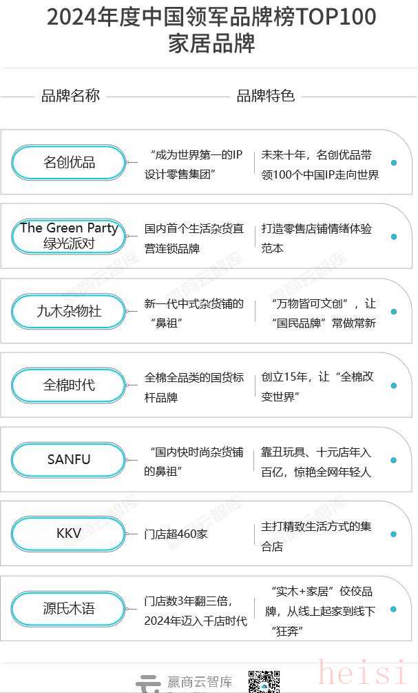 全球IP聯(lián)名集合店 名創(chuàng)優(yōu)品 ,與超150個全球知名IP合作,持續(xù)輸出好看、好玩、好用的產(chǎn)品,承包了當(dāng)下年輕人喜歡的一切,成為去班味、解壓治愈好去處。以“雜貨之名”的 The Green Party綠光派對、九木雜物社、SANFU ,或用“二次元”撬動1500W+用戶,或走中式文創(chuàng)風(fēng),或“搞怪丑萌”出圈,總有一個戳中你的情緒爆點。 全棉時代 ,成立15年,縱風(fēng)波起伏,始終堅守“全棉改變世界”。新上榜的 源氏木語 是其中“最家居的”品牌,成立十來年,從線上到線下,它是年輕人眼中的“中國版宜家”,是中年人眼中可負擔(dān)的實木家具首選品牌。