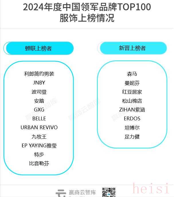 上述熱門品類之外,《2024年度中國領(lǐng)軍品牌TOP》首次上榜了木梳、商超、折扣店三大品類領(lǐng)軍品牌—— 木梳第一品牌譚木匠、新零售商超第一品牌盒馬、折扣店第一品牌好特賣HotMaxx 。在小紅書上,“譚木匠最值得入手的梳子”相關(guān)筆記119萬+篇,它成了當(dāng)下年輕人送禮首選,從百元入門款到千元貴付款,總有一款拿得出手;而經(jīng)歷過山車劇情的盒馬,重回快速拓店軌道,成為“實力派”小城熱捧的對象;好特賣HotMaxx成立四年,開店900家,GMV破50億,成為國內(nèi)第一折扣品牌,并準(zhǔn)備殺向日本,與大創(chuàng)、堂吉訶德們一決高下。二、服飾:蟬聯(lián)者“穩(wěn)如泰山”,新晉者各有爆發(fā)力《2024中國領(lǐng)軍品牌TOP100》中,服飾上榜品牌有19個。蟬聯(lián)上榜者,或不是風(fēng)頭最盛者,卻皆有一副王者的沉穩(wěn)之姿。