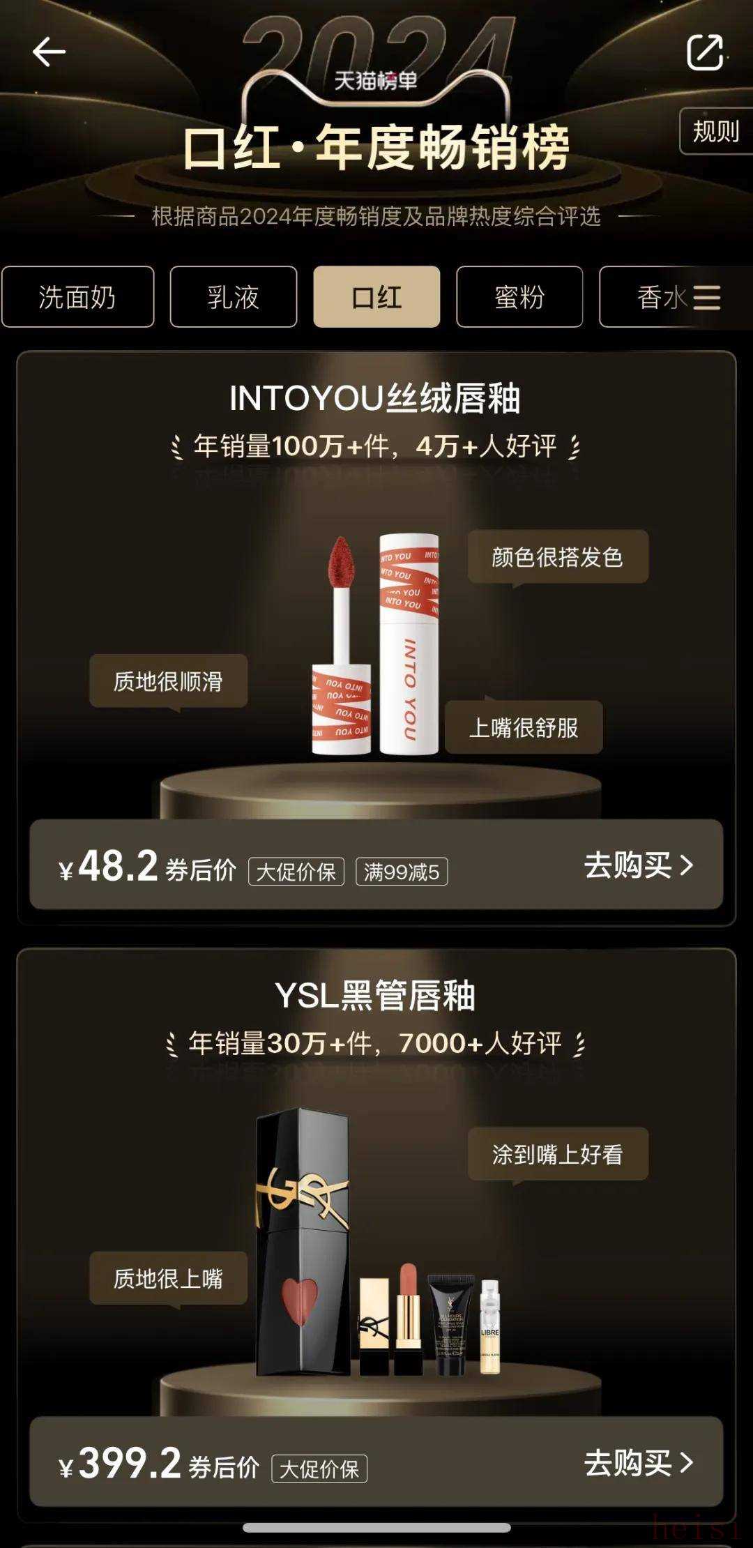 2024年的消費市場宛如一片波濤洶涌的海洋,諸多變革重塑著商業(yè)世界的格局。《天下網(wǎng)商》觀察到:一方面,消費者在購物時愈發(fā)理性,更注重產(chǎn)品的質(zhì)價比,關(guān)注產(chǎn)品品質(zhì)與長期使用價值,同時他們開始追求功能之外的更多滿足,諸如情感共鳴、社交屬性以及個性化體驗;另一方面,消費者的行為模式有了一定的更迭,大家從主動搜索商品轉(zhuǎn)變?yōu)榻邮軅€性化推薦或直接查看各類榜單,傾向于根據(jù)他人種草或榜單數(shù)據(jù)篩選購買商品。這些轉(zhuǎn)變,如暗流般悄無聲息地推動著諸多品牌的產(chǎn)品結(jié)構(gòu)和營銷策略在發(fā)生變化,而這其中,能夠敏銳洞察市場變化,精準把握消費潮流的品牌和產(chǎn)品,方能嶄露頭角。過去一年,天貓榜單持續(xù)為消費者提供消費決策建議,相繼發(fā)布天貓V榜年度單品、雙11超級必買榜等榜單。在年終之際,為了給平臺消費者推薦年度值得購買的爆款好物,天貓榜單篩選了涵蓋品類更全面的百大品類中極具競爭力的TOP商品。在“2024天貓榜單年度暢銷榜”中,《天下網(wǎng)商》看到了上榜的年度爆品所透傳的消費新趨勢:1.從價格轉(zhuǎn)向價值,品質(zhì)消費崛起。消費者對生活品質(zhì)的追求愈發(fā)強烈,品質(zhì)家電、智能家居、按摩椅、醫(yī)藥健康品類商品的熱銷便是有力證明。消費者在選購商品時更加注重產(chǎn)品的性能、材質(zhì)、科技含量以及品牌口碑,而不僅僅是價格標簽。例如冰箱品類中,具備健康凈味、全空間保鮮、智能控溫等全面功能冰箱,更受消費者歡迎;為用戶徹底解放雙手,同時擁有強大清潔能力和自清潔功能的掃地機器人成為家庭的不二選擇;智能監(jiān)控、智能門鎖、智能電視等家居產(chǎn)品的興起,更是品質(zhì)消費的生動體現(xiàn),例如小米指紋鎖E10、Vidda發(fā)現(xiàn)X85電視、云鯨J5掃地機器人、海爾云溪386洗烘套裝等。2.療愈經(jīng)濟與情緒消費興起。香水、身體乳、美容儀、投影儀、微單等產(chǎn)品,除了功能價值,正疊加更多情緒價值,為消費者提供心靈慰藉與身心療愈的產(chǎn)品,正在成為消費者的共同選擇,例如Chanel柔情香水、YSL自由之水、迪奧小姐花漾香水等產(chǎn)品,不僅僅是氣味的載體,更是自我個性的表達,從TOP10上榜的香水來看,消費者普遍偏好留香久、名稱帶有抒發(fā)主張以及瓶身好看的產(chǎn)品。微單相機成為年輕人記錄美好瞬間、為生活增添情感溫度的重要工具。記錄美好瞬間,為生活增添情感溫度,索尼ZV—E10L微單相機、索尼雙影響微單相機、尼康Z5全畫幅微單相機等上榜商品成為熱捧的“撿寶”對象;隨著消費者對家庭娛樂體驗的追求不斷提升,極米投影儀、堅果家庭投影儀、當貝高清投影機等投影儀上榜爆品也在過去一年大獲關(guān)注。3. 國貨正逐漸進入消費爆品舞臺中心。隨著年輕一代成為消費主力軍,他們對國貨的接受度和購買意愿顯著提升,電商平臺更是為國貨品牌崛起提供了更廣闊的展示舞臺,尤其在美妝、家居用品等領(lǐng)域,消費者對國貨的偏好將進一步增強。在此次年度榜單中,“貼片面膜年度暢銷榜”中的“璦爾博士保濕面膜”、“洗面年度暢銷榜“中的“至本保濕清潔洗面奶”、“口紅年度暢銷榜”中的“INTOYOU絲絨唇釉”、“面霜年度暢銷榜”中的“珀萊雅紅寶石面霜3.0.”.....國貨品牌憑借其卓越的產(chǎn)品力及對本土市場的深刻洞察,逐漸在天貓年度榜單中嶄露頭角,與國際品牌平分秋色。