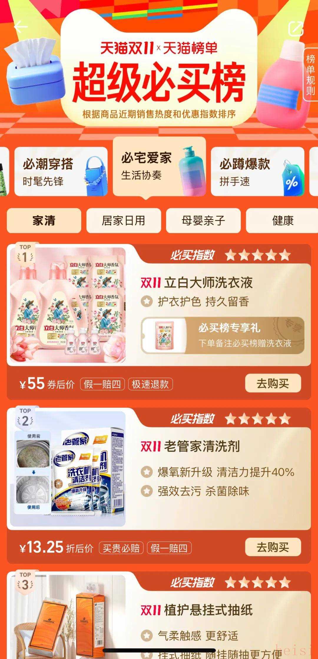 這個(gè)雙11,品牌面對的是越來越理性、冷靜的消費(fèi)者。有市場研究數(shù)據(jù)顯示,相比去年同期,消費(fèi)者在購物決策上花費(fèi)的時(shí)間整體增加了約25%。消費(fèi)者不容易再為簡單粗暴的大促信息鼓動(dòng),也不為單純的價(jià)格優(yōu)勢買單,從追求“性價(jià)比”到追求“質(zhì)價(jià)比”,再到追求“心價(jià)比”,這背后的變化,是消費(fèi)者越來越難被說服。在著眼于自己最本質(zhì)的需求的同時(shí),決策成本不斷抬升。而基于9億消費(fèi)者選擇的“天貓榜單”,因真實(shí)客觀而更容易被信任。據(jù)消費(fèi)者行為學(xué)分析,隨著供給的豐富度提升,面對海量商品,消費(fèi)者容易陷入選擇困境。相較于商家營銷說服等行為,消費(fèi)者更易于參考并接受他人的消費(fèi)選擇?;谝酝M(fèi)者購買數(shù)據(jù)反映的真實(shí)商品排名在用戶心中的角色,相當(dāng)于有了“他人推薦”的信任背書,反映了消費(fèi)者的群體認(rèn)同。社會(huì)認(rèn)同理論也認(rèn)為,當(dāng)品牌頻頻登上消費(fèi)熱度榜單,消費(fèi)者在潛意識(shí)中深化品牌的印象和信任,并默認(rèn)其是經(jīng)過市場驗(yàn)證的商品,減少?zèng)Q策成本,縮短決策時(shí)間。《天下網(wǎng)商》發(fā)現(xiàn),天貓榜單在類目集合、交互方式上都充滿了亮點(diǎn)。洞察消費(fèi)者在不同節(jié)點(diǎn)下的消費(fèi)需求,無論是日常,還是大促期間,天貓榜單都有相應(yīng)節(jié)點(diǎn)的“特別”榜單推出,滿足特殊場景下多樣化購物需求,譬如去年年貨節(jié)推出的“地域必買榜”,今年雙11推出的“超級(jí)必買榜”等。這些不斷刷新的實(shí)時(shí)榜單,不僅是當(dāng)下熱門產(chǎn)品和消費(fèi)趨勢的呈現(xiàn),也在消費(fèi)者購買決策中扮演了越來越重要的角色。《天下網(wǎng)商》觀察到,天貓榜單涵蓋類目多元,且顆粒度十分細(xì)致。譬如個(gè)護(hù)家清類目下,又分為了身體護(hù)理、紙巾濕巾、個(gè)人護(hù)理用品、清潔工具、衣服洗護(hù)、香薰用品、個(gè)人護(hù)理工具、清潔用品、美發(fā)護(hù)發(fā)8個(gè)類目,再細(xì)化到濕廁紙、男士洗發(fā)水等單品榜單。從不同單品維度,消費(fèi)者都能得到啟發(fā)。簡單易達(dá)的看榜體驗(yàn)也吸引了不少消費(fèi)者的駐足。據(jù)了解,本次雙11,淘寶搜索一級(jí)TAB首次增加“榜單”專區(qū),用戶不僅在搜索結(jié)果頁可直接點(diǎn)擊相應(yīng)“榜單”查看上榜商品,還能通過直接搜索“xx榜”的方式直達(dá)對應(yīng)品類榜單。這樣的調(diào)整不僅拓寬了豐富度,也優(yōu)化了消費(fèi)者觸達(dá)路徑,讓用戶購物決策更便捷更簡單。