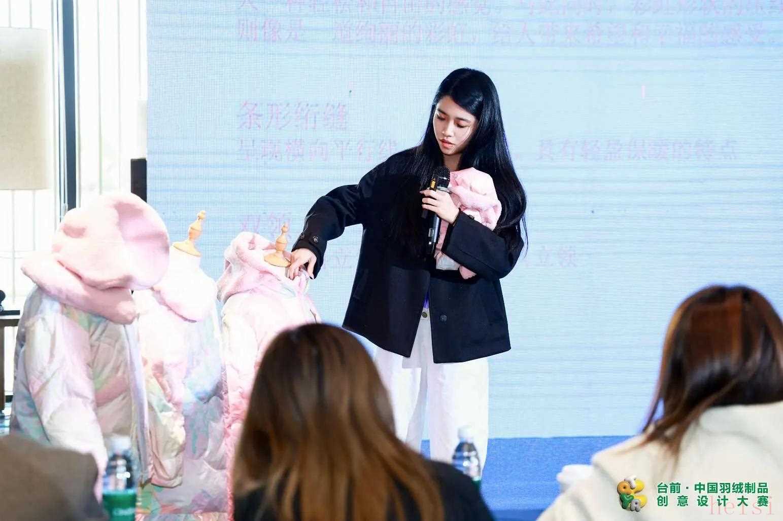 決賽環(huán)節(jié),一件件設(shè)計獨特的羽絨服、羽絨被等羽絨制品輪番亮相。選手們從靈感來源、制作過程、面料運用、版型設(shè)計、制作工藝等方面介紹各自的作品,并回應在座評委的問詢。參賽作品充滿了創(chuàng)意設(shè)計的靈動和青年設(shè)計師的活力,也在努力兼顧實用性和商業(yè)落地性,讓評委們感覺眼前一亮。11位評委也從各自的專業(yè)角度,結(jié)合最新流行趨勢,就羽絨制品在產(chǎn)品開發(fā)、技術(shù)運用、設(shè)計創(chuàng)意等方面的表現(xiàn)進行了點評。