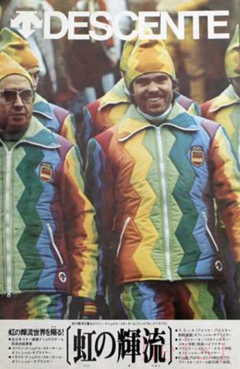 Kiryu的滑雪服初舞臺(tái),是1976年奧地利因斯布魯克冬奧會(huì)上,西班牙國(guó)家高山滑雪隊(duì)身穿彩虹輝流滑雪服亮相賽場(chǎng),這也是DESCENTE首次正式出現(xiàn)在冬奧會(huì)上。