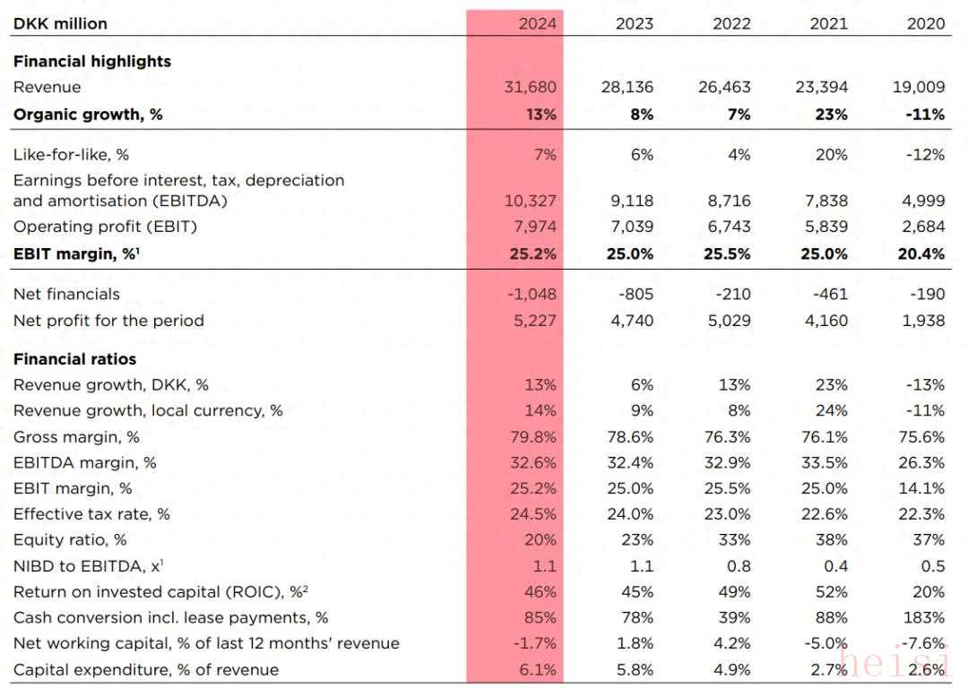 從2021年~2024年,潘多拉的年銷售額(單位:丹麥克朗)一路走高,分別為233.94億克朗、264.63億克朗、281.36億克朗、316.8億克朗(約合人民幣355億元);對(duì)應(yīng)凈利潤分別為41.6億克朗、50.3億克朗、47.4億克朗、52.27億克朗;對(duì)應(yīng)毛利率則分別為76.1%、76.3%、78.6%、79.83%。