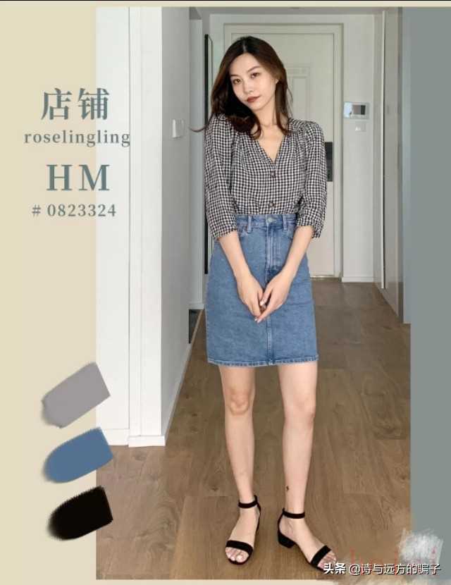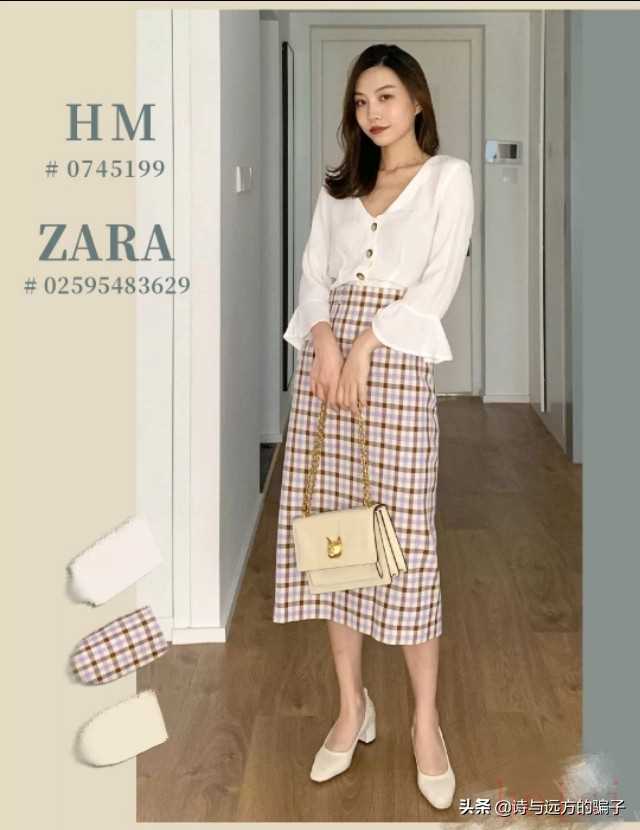HM與ZARA的搭檔組合。格子直筒中長(zhǎng)款半身裙奠定了優(yōu)雅又溫柔氣質(zhì)風(fēng)的格調(diào)基礎(chǔ),上身搭配一件簡(jiǎn)單的雪紡衫,V領(lǐng)的設(shè)計(jì)更顯瘦