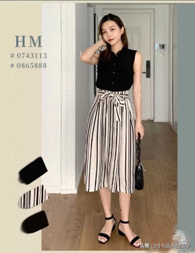 第一套來(lái)自上下裝都是來(lái)自HM,修身的黑色基礎(chǔ)小背心到底條紋中長(zhǎng)款A(yù)字裙,上衣的修身與下身裙子的寬松正好遮肉顯瘦兩不誤,并且高腰強(qiáng)調(diào)黃金比例與腿長(zhǎng),中長(zhǎng)款的長(zhǎng)度又更顯優(yōu)雅端莊。