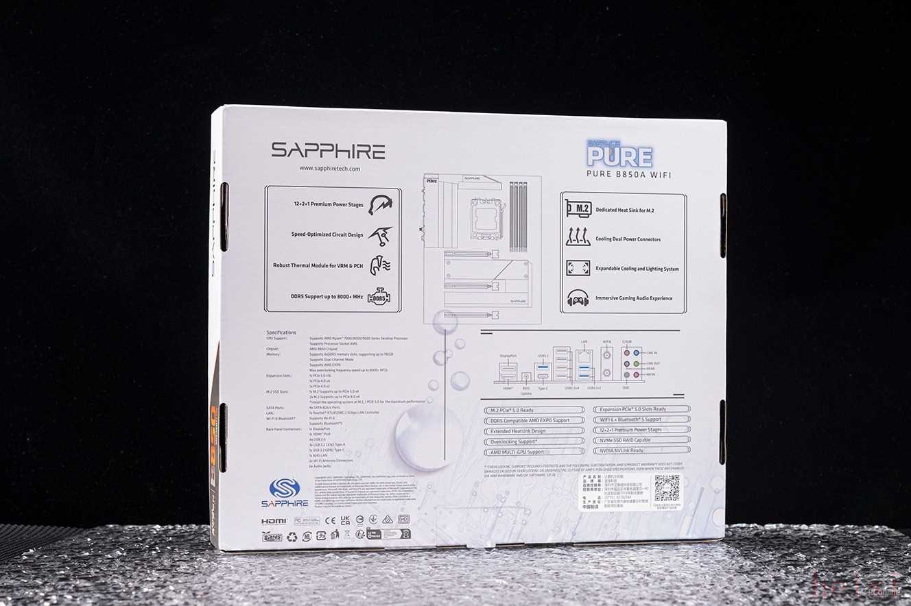 首先讓我們先來看這次PURE極地B850系列的老大哥——藍寶石PURE極地B850A WIFI主板,外包裝設(shè)計上延續(xù)了過往PURE系列的特色,讓人一眼就能看出這款主板主打的就是純白設(shè)計,并且正面包裝還有PURE系列獨有的標識,科技感十足。
