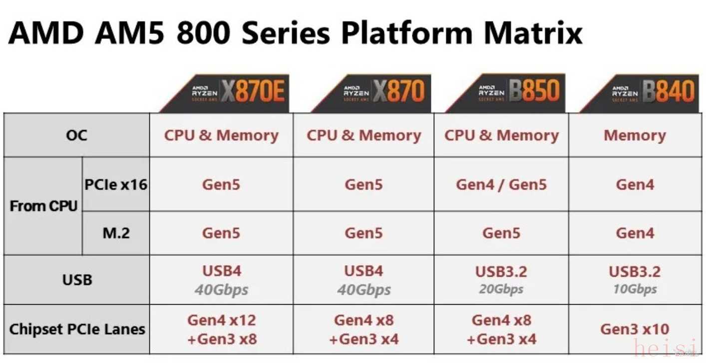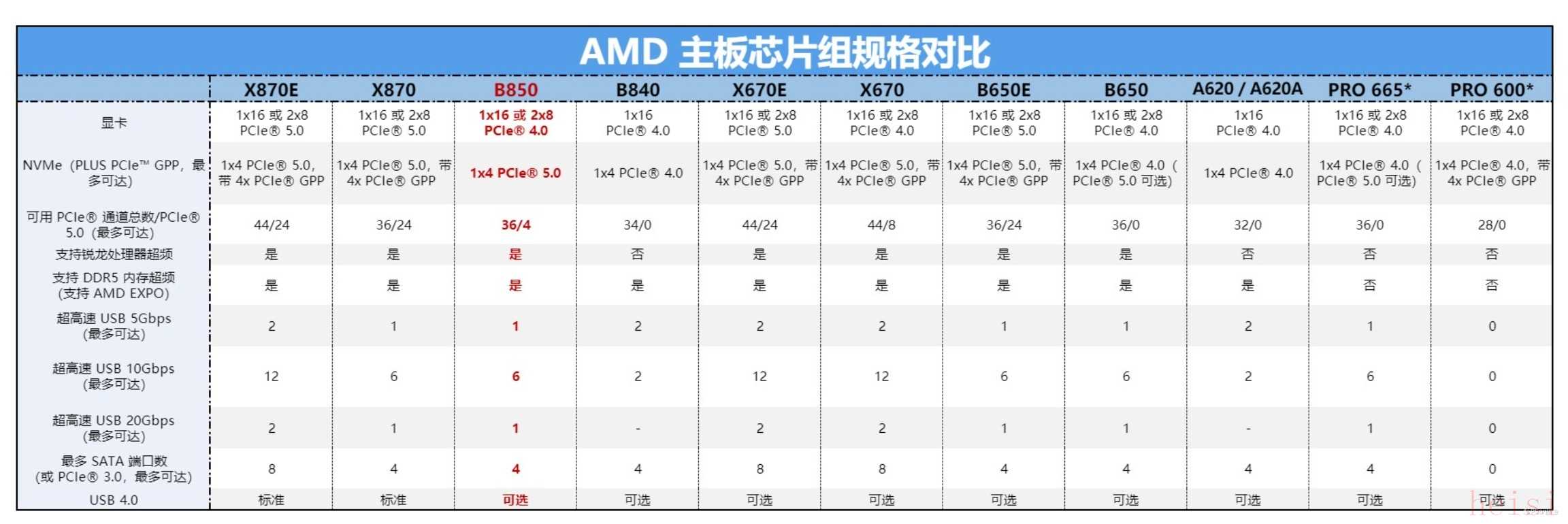 我們先來看看新的B850主板芯片組詳細規(guī)格。作為一款主流級別的芯片組,AMD B850的規(guī)格無疑能夠充分滿足大多數(shù)用戶的需求:1.它支持處理器與內(nèi)存的超頻;2.PCIe插槽與M.2固態(tài)硬盤插槽均支持最新的PCIe 5.0規(guī)范;3.原生提供USB 3.2 Gen2 x2 20Gbps接口;4.芯片組內(nèi)置8條PCIe 4.0通道與4條PCIe 3.0通道。配合其合理的價格,主板制造商能夠打造出性價比高、擴展性能出色的千元級別主板。