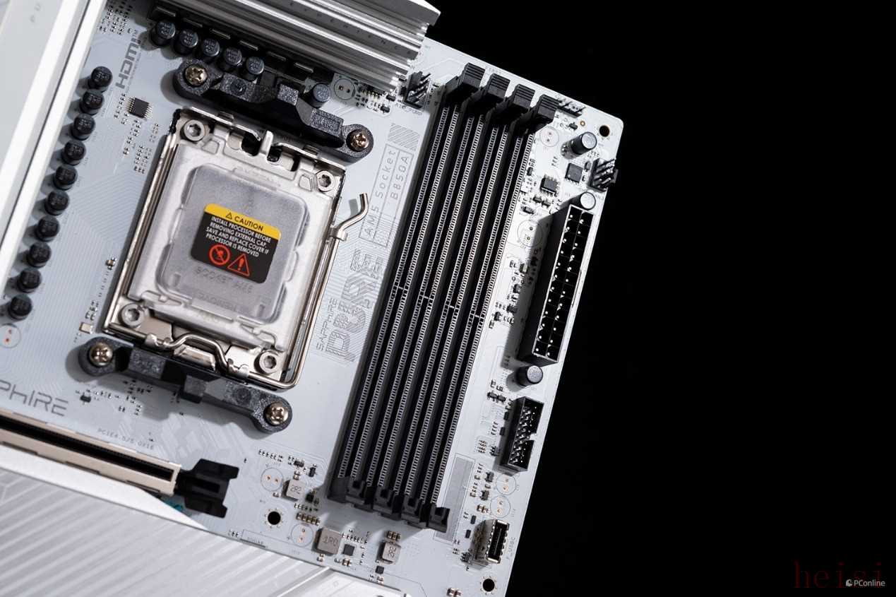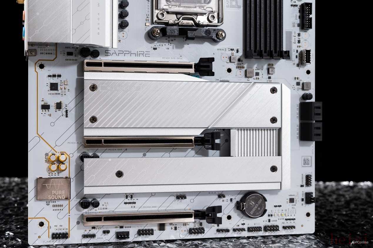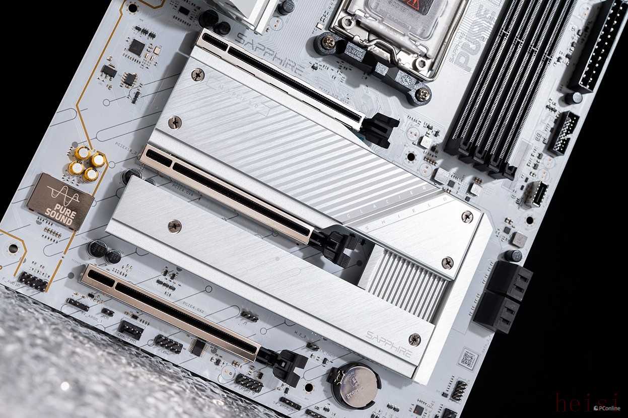 這款主板的PCIe插槽數(shù)量也給得非常足,從這個視角看去,主板提供了三根PCIe全尺寸插槽,帶寬分配上,頂部的PCIe插槽由CPU直接提供PCIe 5.0×16帶寬,中間的PCIe插槽由B850芯片組提供PCIe 4.0×4帶寬,最后一根PCIe插槽則支持PCIe 4.0×2帶寬,基本可以滿足各類I/O設(shè)備的拓展需求。并且藍寶石給每個PCIe插槽都用上了合金裝甲加固,細節(jié)好評。