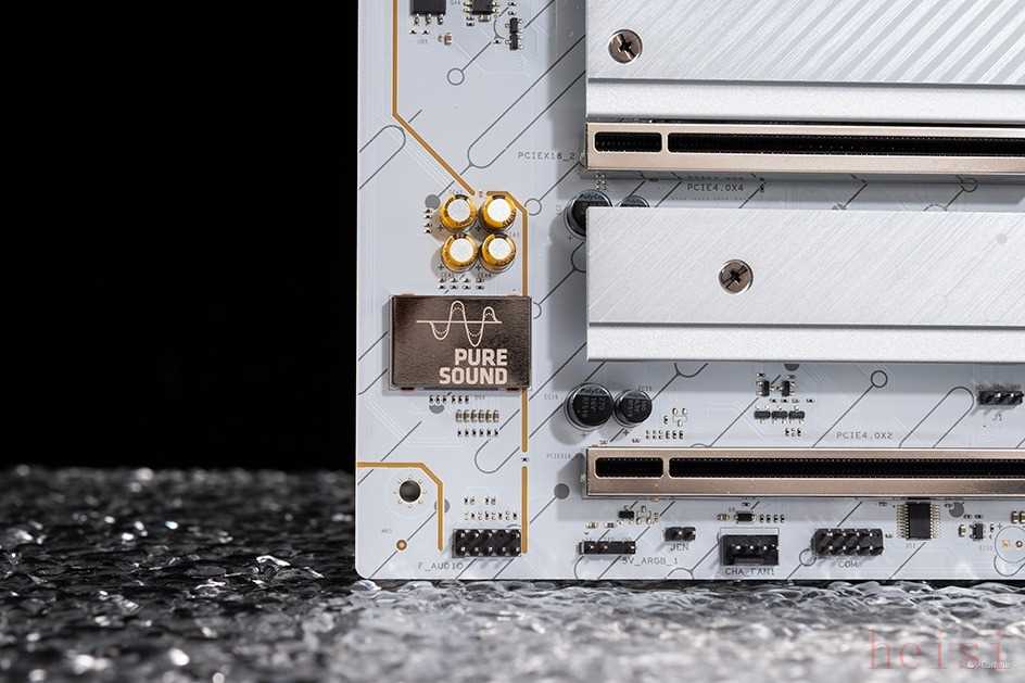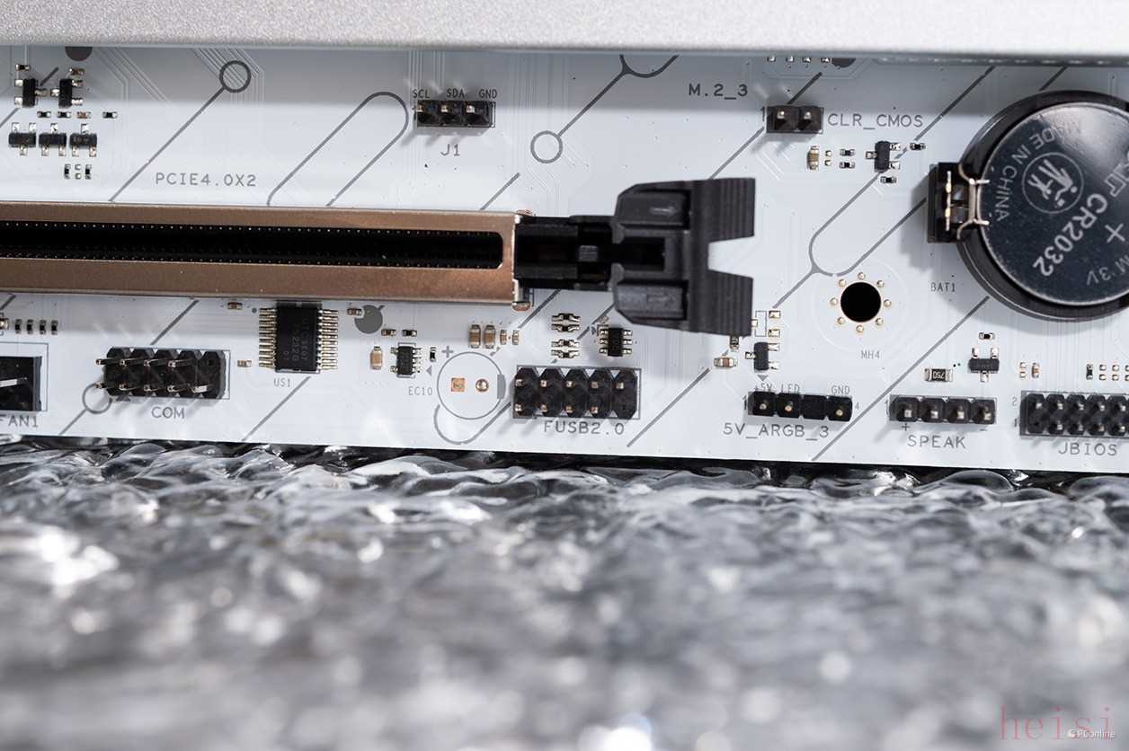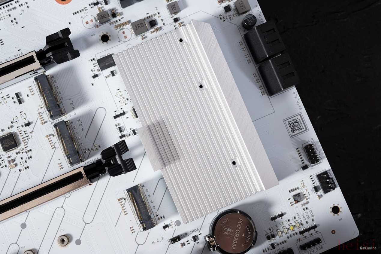 在PCIe插槽之間是兩塊銀白色的散熱裝甲,這里是主板M.2固態(tài)硬盤的位置。