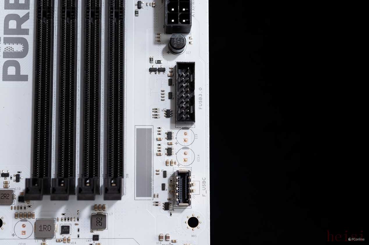 藍寶石PURE極地B850A WIFI主板也提供了豐富的擴展接口,主板旁邊有USB前置拓展接針,可以擴展出2個USB 3.2 Gen 1 5Gbps(Type-A)接口以及1個前置USB 3.2 Gen 1 5Gbps (Type-C)接口,這個配置基本能夠滿足玩家的擴展需求。