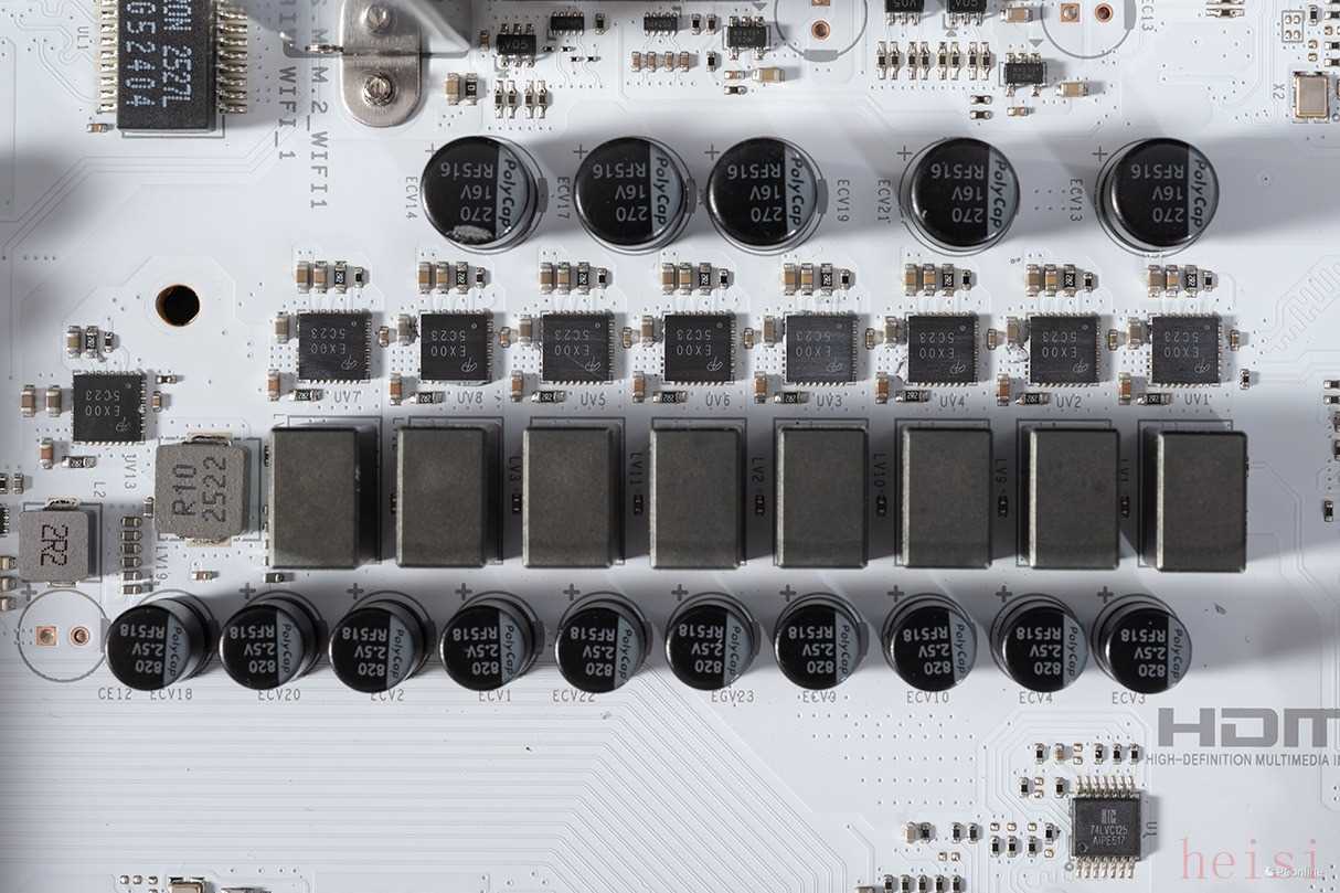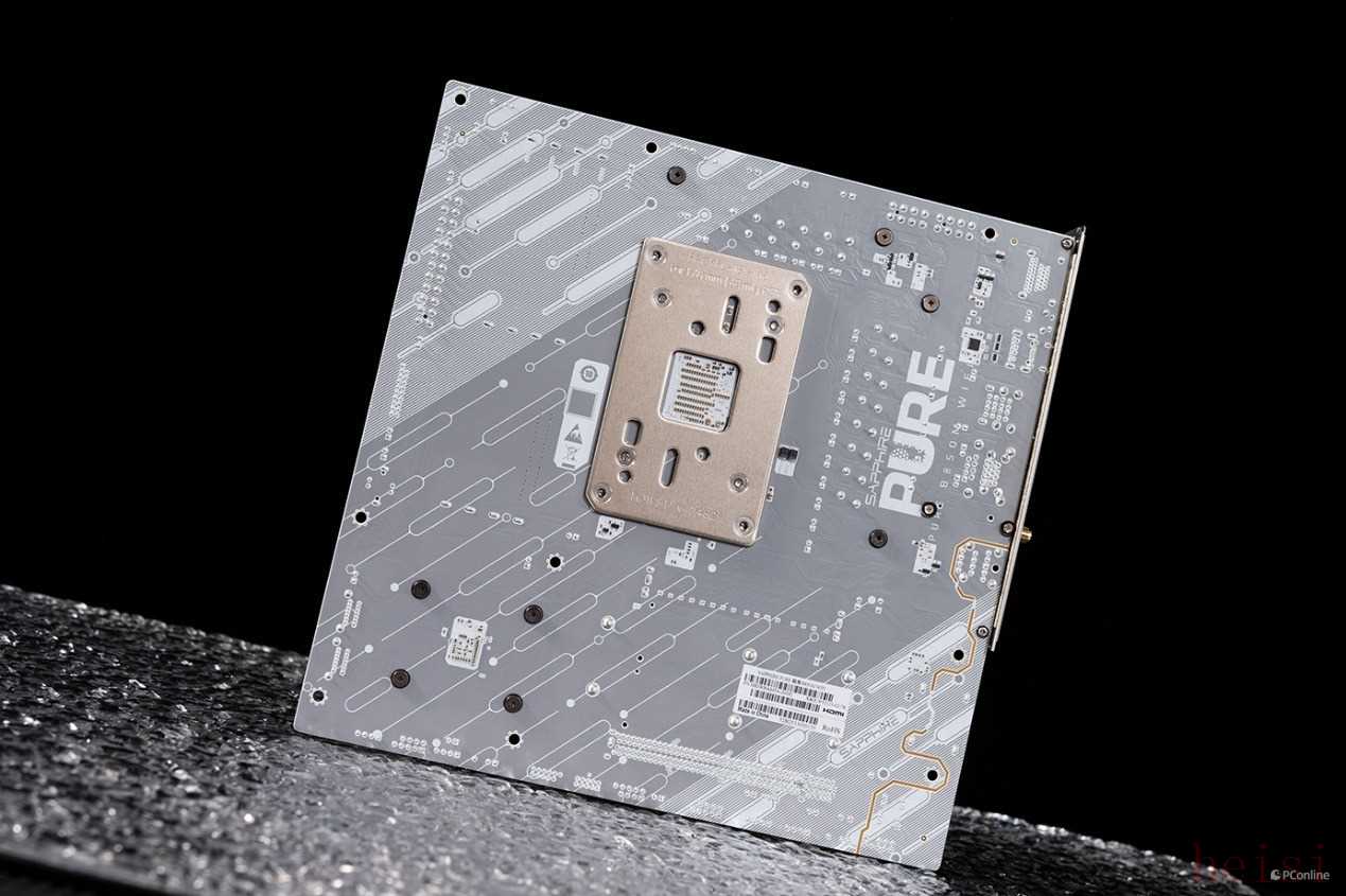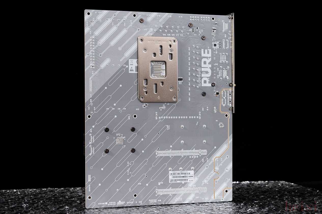 背面也做了白色處理,與正面相得映彰。走線也非常規(guī)整,做工同樣出色,據(jù)介紹,其在內(nèi)存與PCIe插槽處是采用了成本更高、技術(shù)更為先進的SMT貼片工藝,電氣性能更佳。