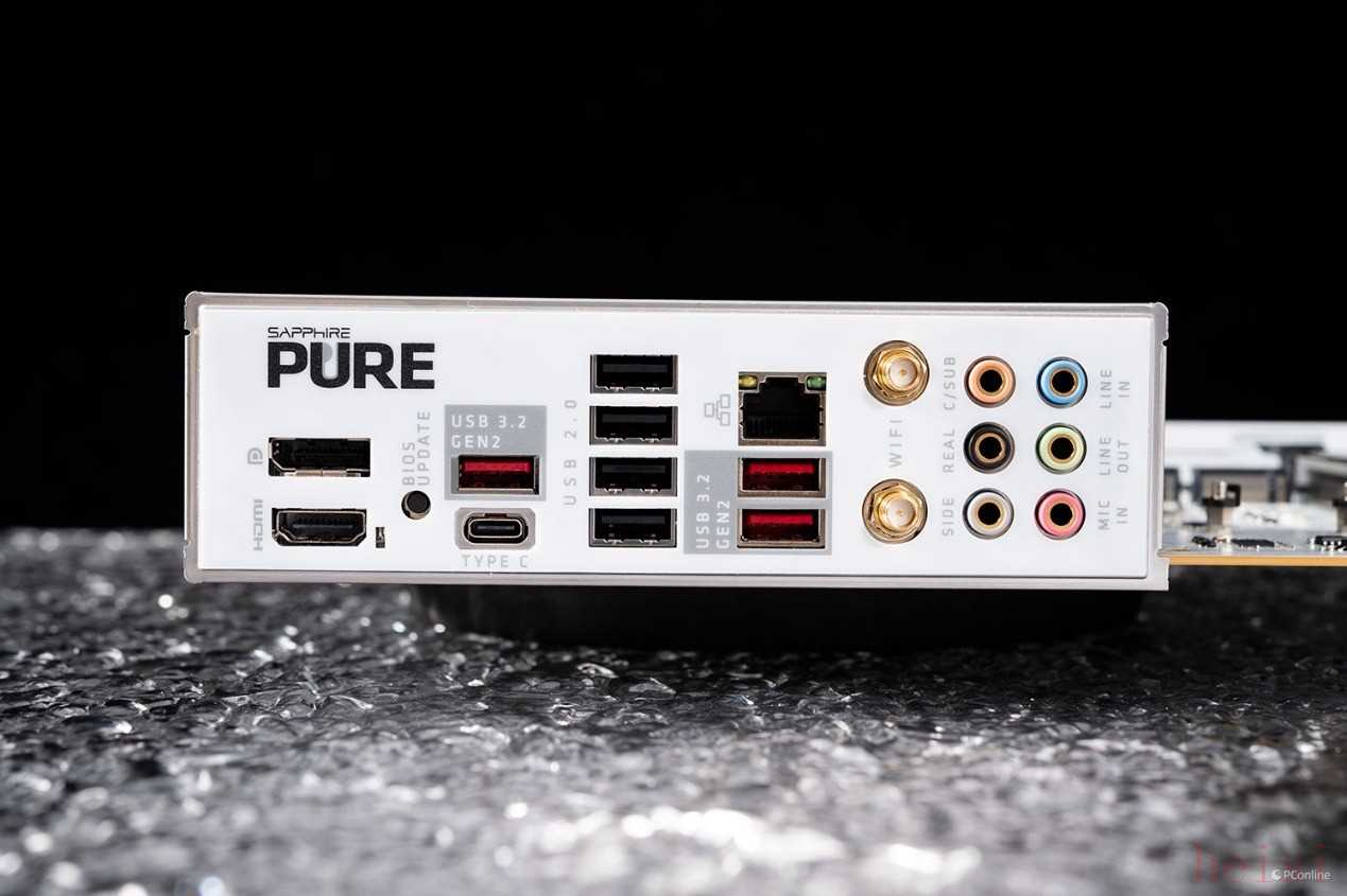 最后我們再來看看藍寶石PURE極地B850A WIFI主板的后置IO接口,不得不說配置還是非常豐富的,從上到下依次是1個DP,1個HDMI,4個USB 2.0接口,3個USB 3.2 Gen 2接口、1個USB 3.2 Type-C Gen 2接口;此外還包括1個2.5G有線網(wǎng)口、Wi-Fi 6天線接口以及聲道音頻接口。這款主板后置還有一個UPDATE BIOS按鈕,以及前置提供Clear BIOS按鈕和DEBUG指示燈,實用性拉滿。